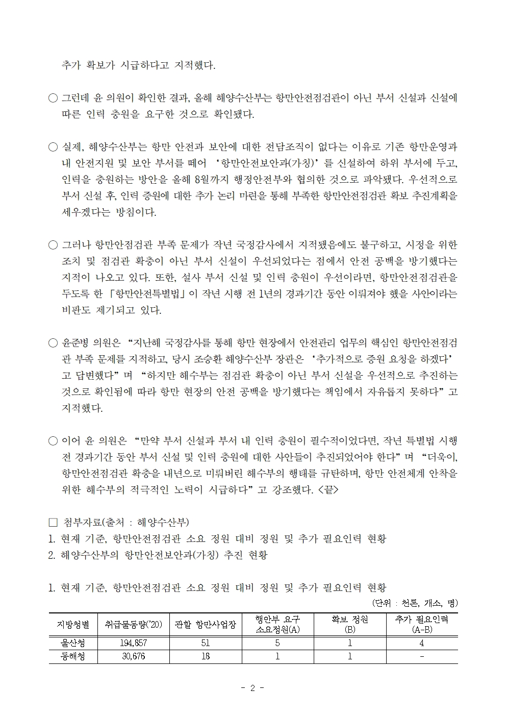 [윤준병 의원 국정감사 보도자료] 윤준병 의원, 항만안전점검관 태부족에도 부서 신설이 먼저라는 해수부