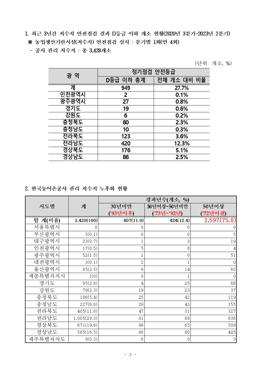 [윤준병 의원 국정감사 보도자료] 윤준병 의원, 농어촌공사 관리 저수지 극한호우 대비 설계기준 강화 필요!