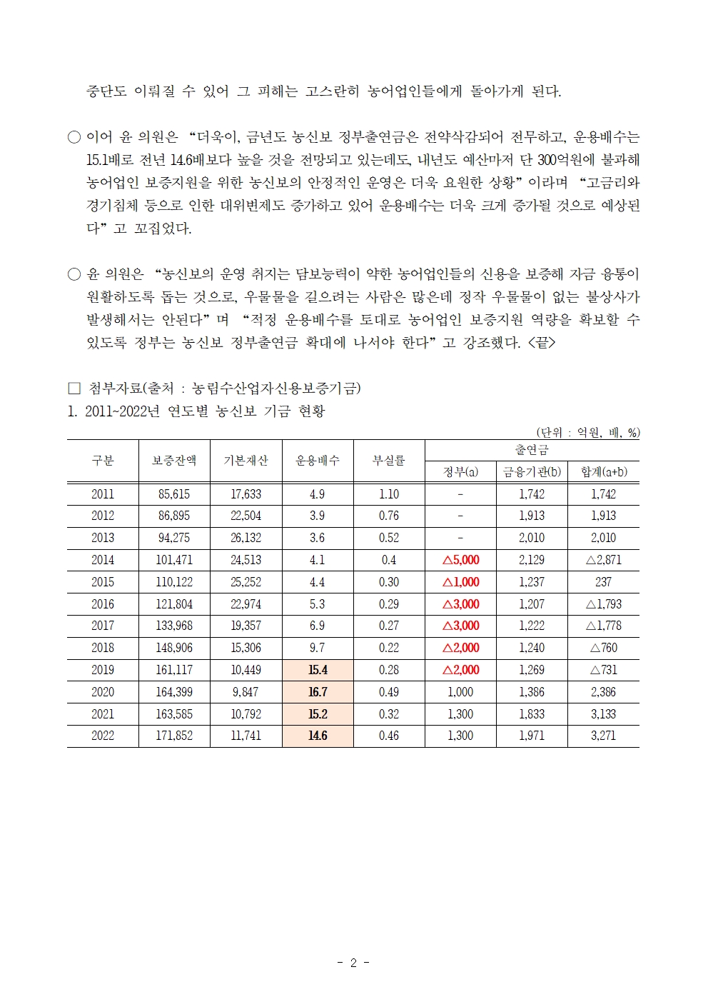 231013 [윤준병 의원 국정감사 보도자료] 윤준병 의원 안정적인 보증지원 위해 농신보 정부출연금 확대해야!.hwp