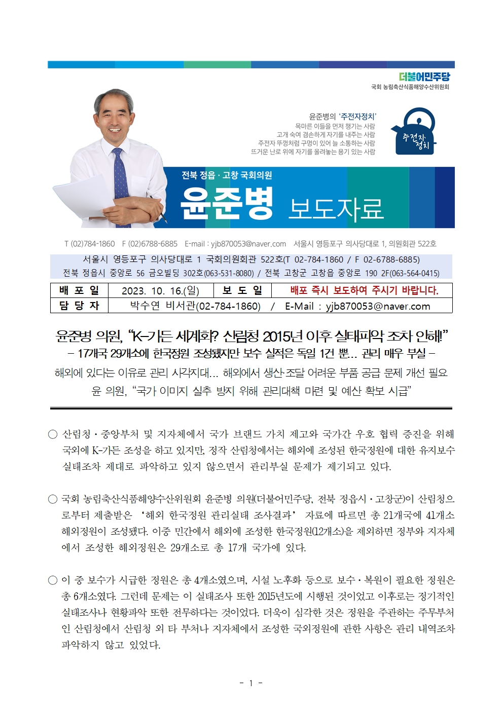 231016 [윤준병 의원 국정감사 보도자료] 윤준병 의원 “K-가든 세계화 산림청 2015년 이후 실태파악 조차 안해!”.hwp