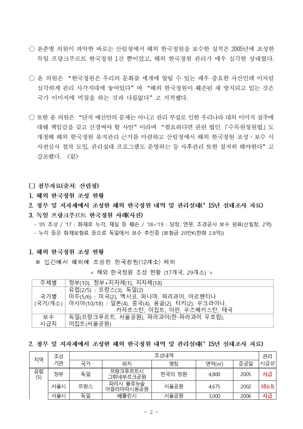 [윤준병 의원 국정감사 보도자료] 윤준병 의원, “K-가든 세계화 산림청 2015년 이후 실태파악 조차 안해!”