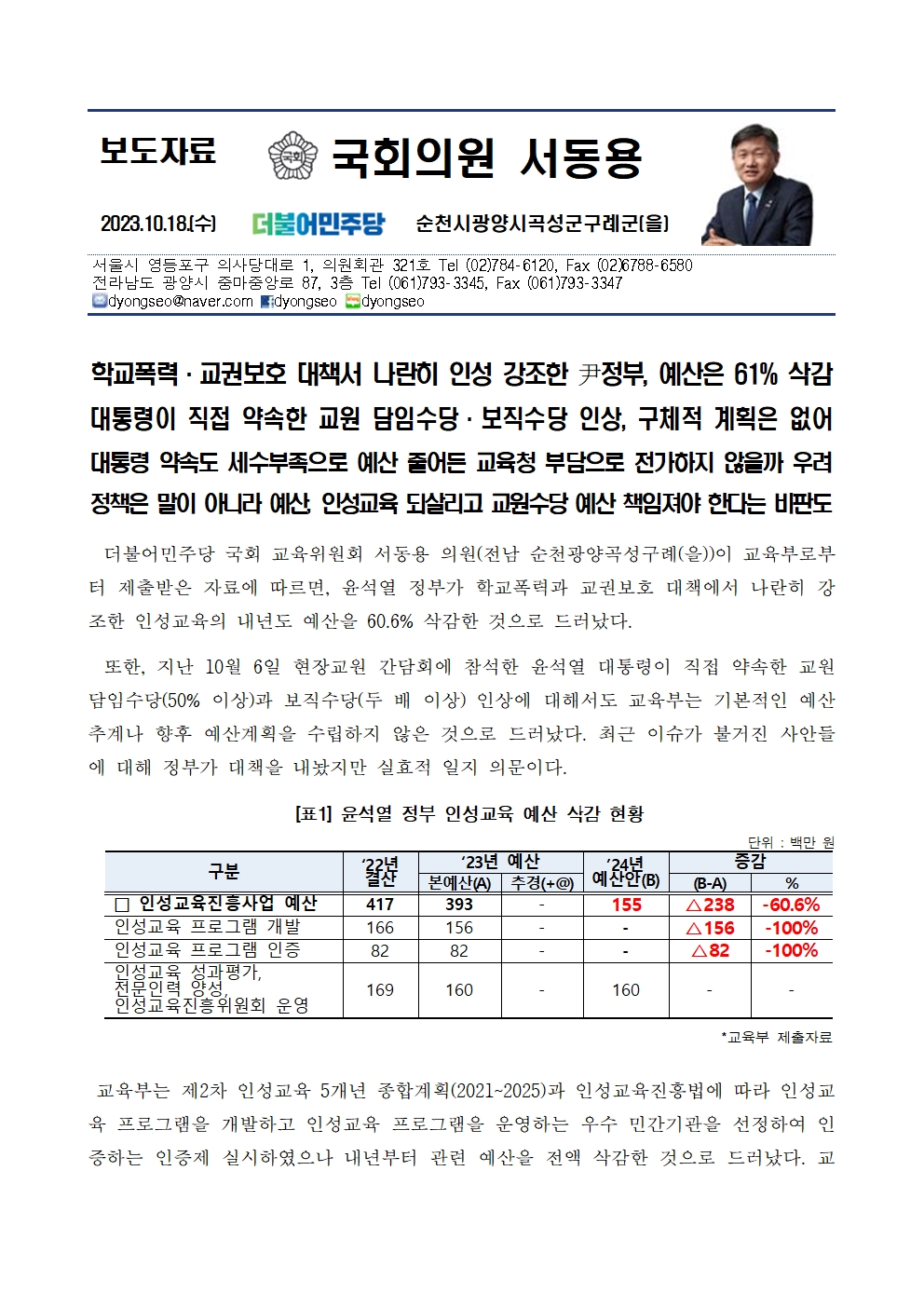 [서동용 의원] 학교폭력·교권보호 대책서 나란히 인성 강조한 尹정부, 예산은 61% 삭감