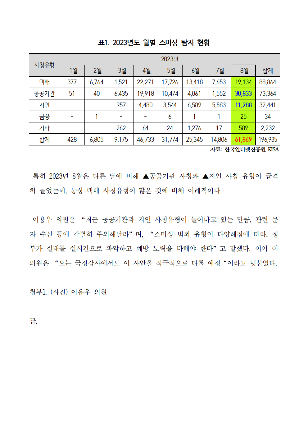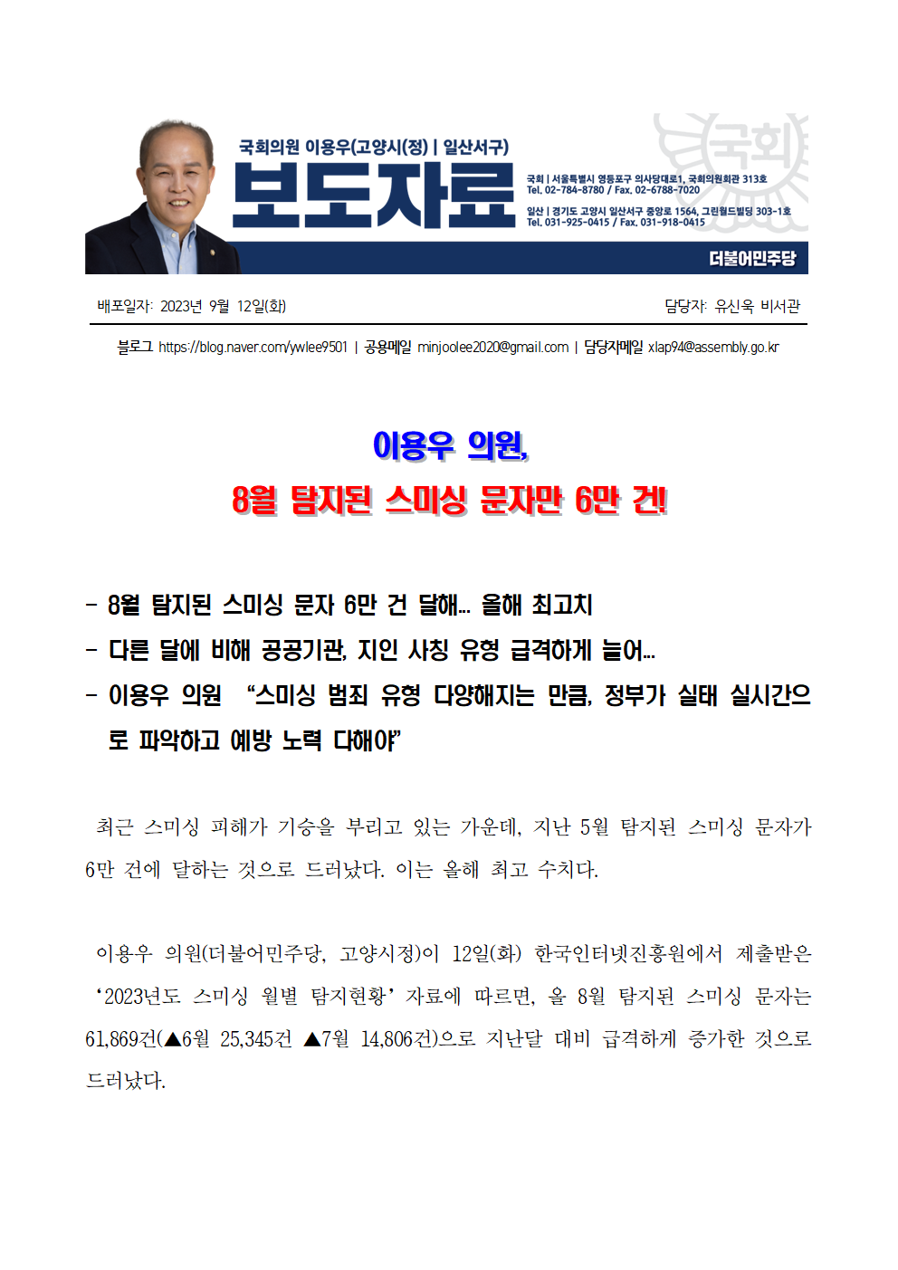 [보도자료] 이용우 의원_ 8월 탐지된 스미싱 문자만 6만 건!.hwp