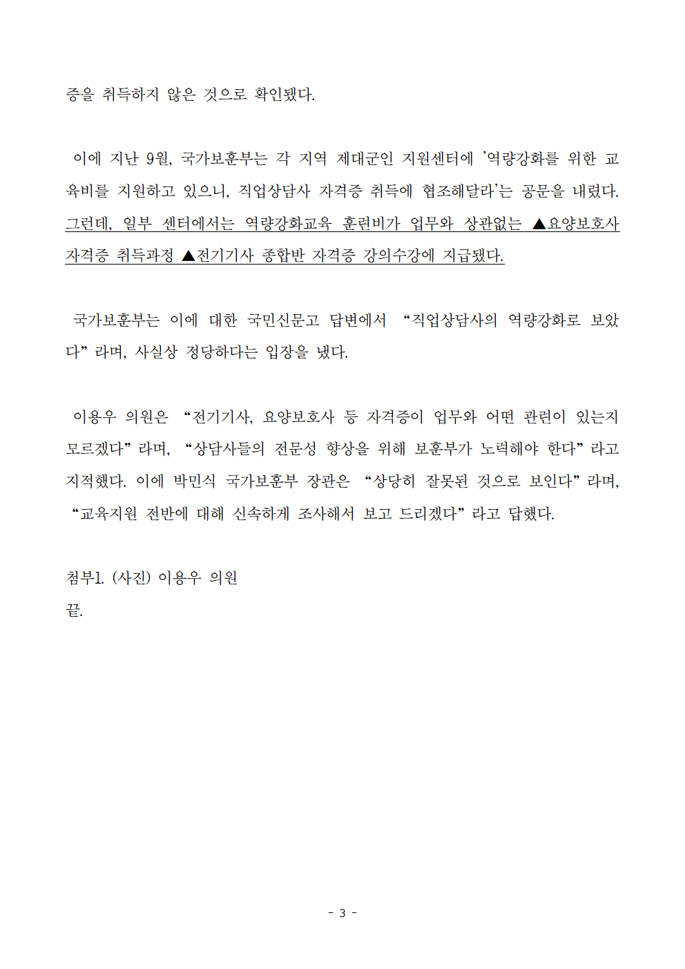 [이용우 의원] 전기기사 자격증이 상담사 역량강화? 이용우 의원, 국가보훈부가 제대군인 지원센터 상담사 전문성 향상 위해 노력해야