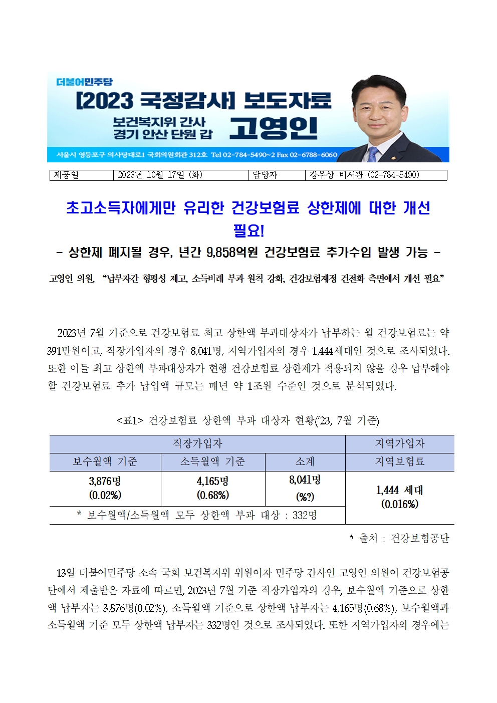 2023_1017_보도자료_초고소득자에게만_유리한_건강보험료_상한제에_대한_개선_필요.hwp