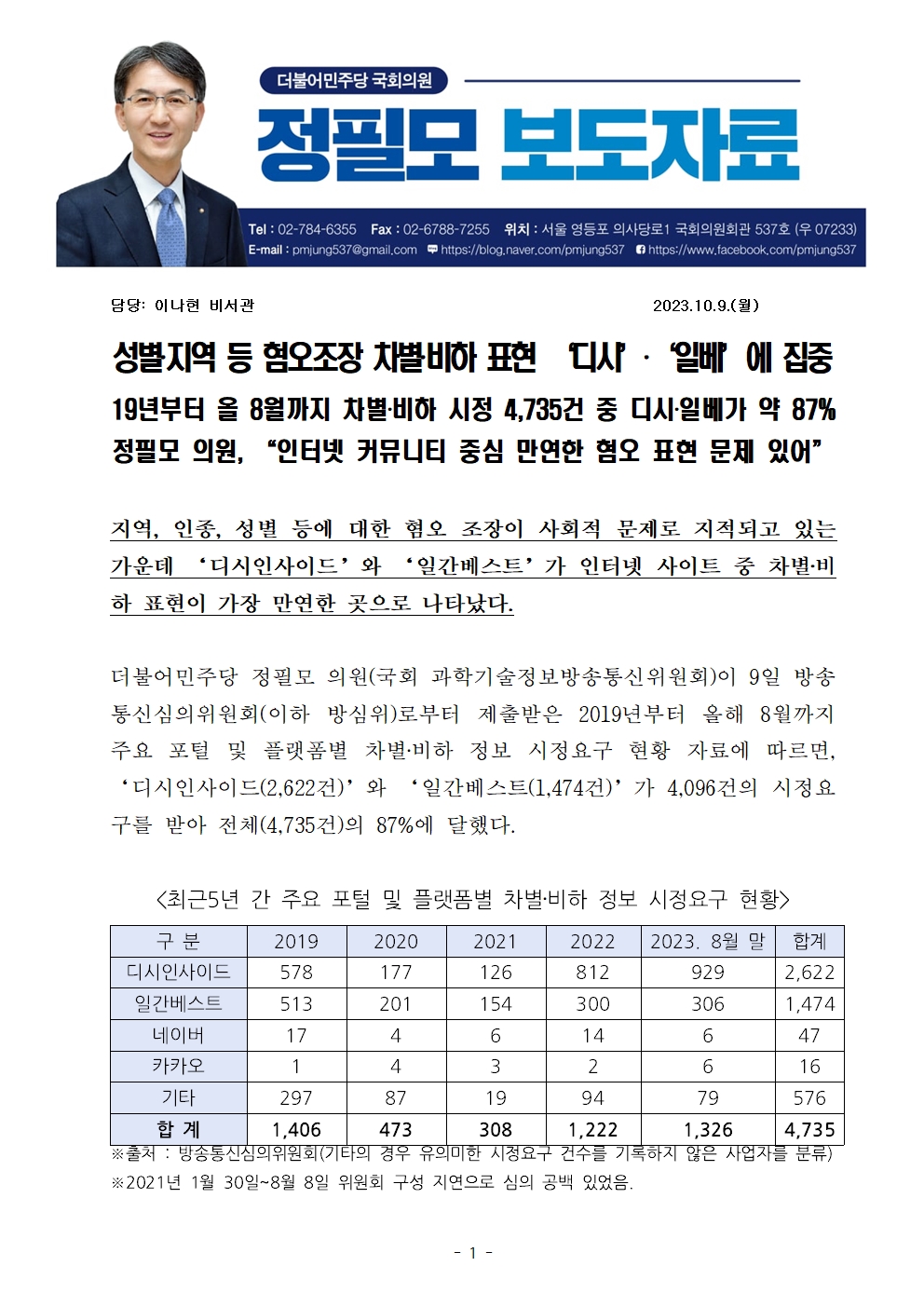 [정필모 의원 보도자료] 성별‧지역 등 혐오조장 차별‧비하 표현 ‘디시’‧‘일베’에 집중