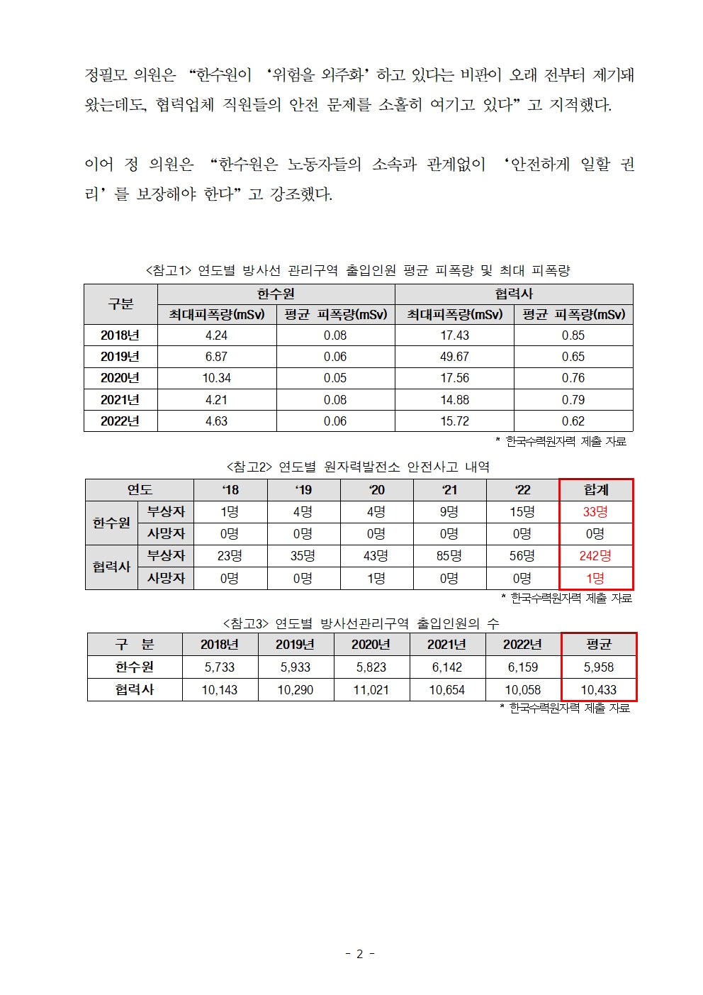 [정필모 의원 보도자료] 협력업체 직원 평균 피폭량, 한수원 직원의 10배