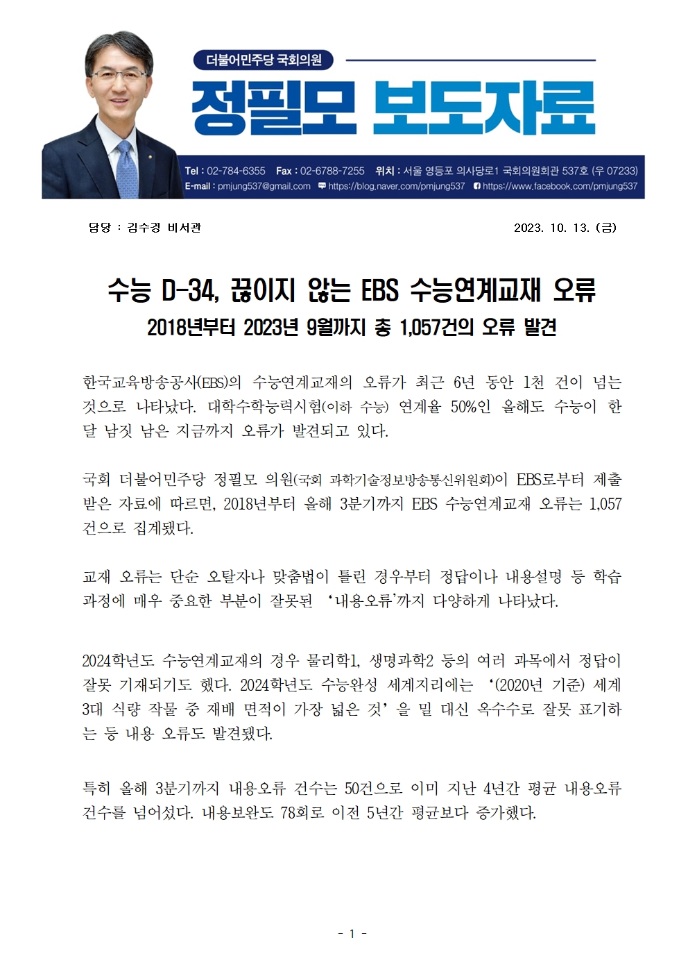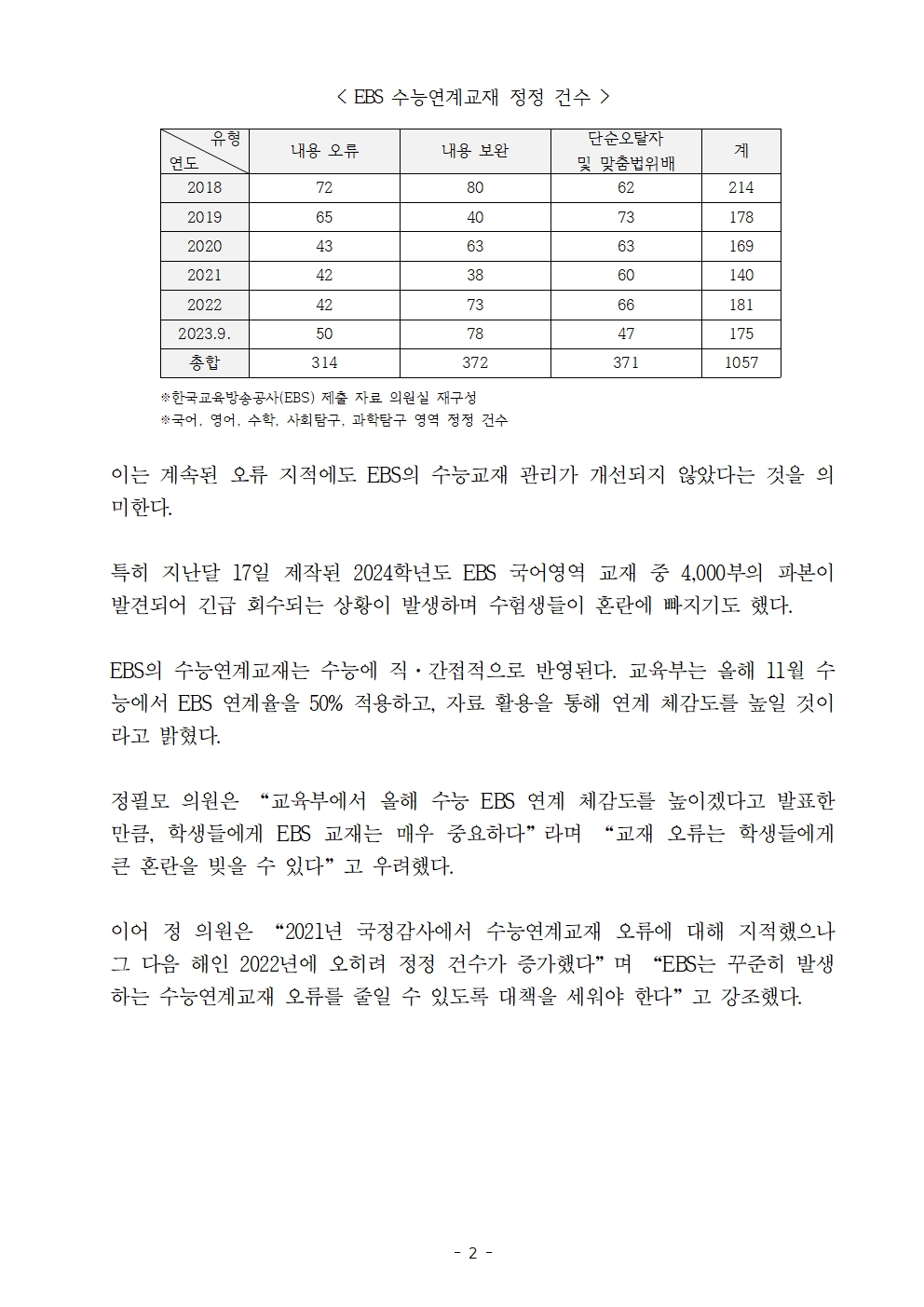 [정필모 의원 보도자료] 수능 D-34, 끊이지 않는 EBS 수능연계교재 오류