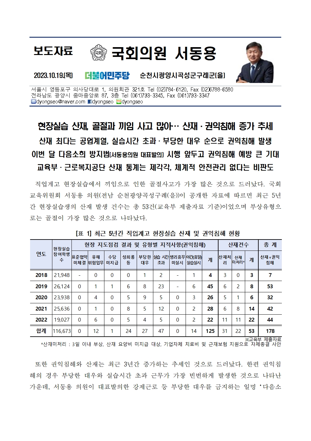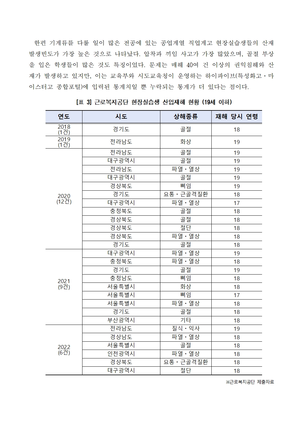 231019_국감_서동용_현장실습생_산재_골절과_끼임_최다_체계적_안전관리는_소홀.hwp
