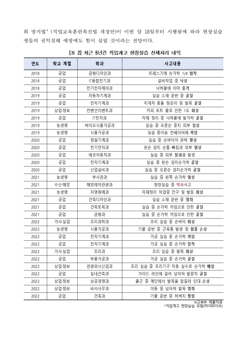 [서동용 의원] 현장실습 산재, 골절과 끼임 사고 많아… 산재·권익침해 증가 추세