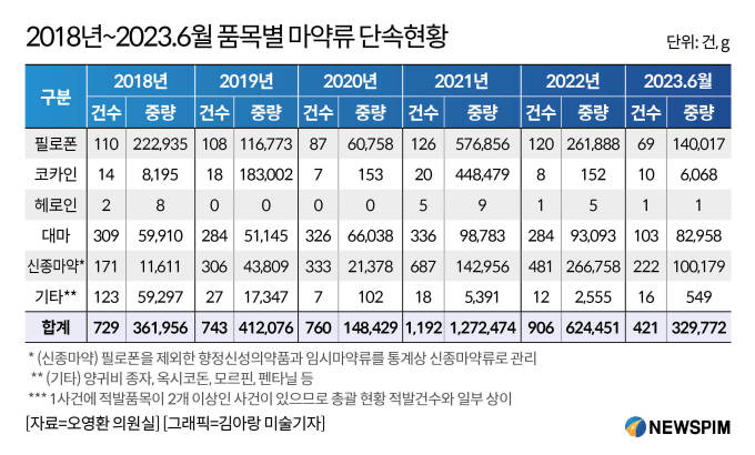 관세청에서 제공한 2018년부터 올해 6월까지 품목별 마약류 단속현황을 보면 향정이 포함되는 신종마약류의 적발 중량은 5년동안 꾸준히 증가했다.