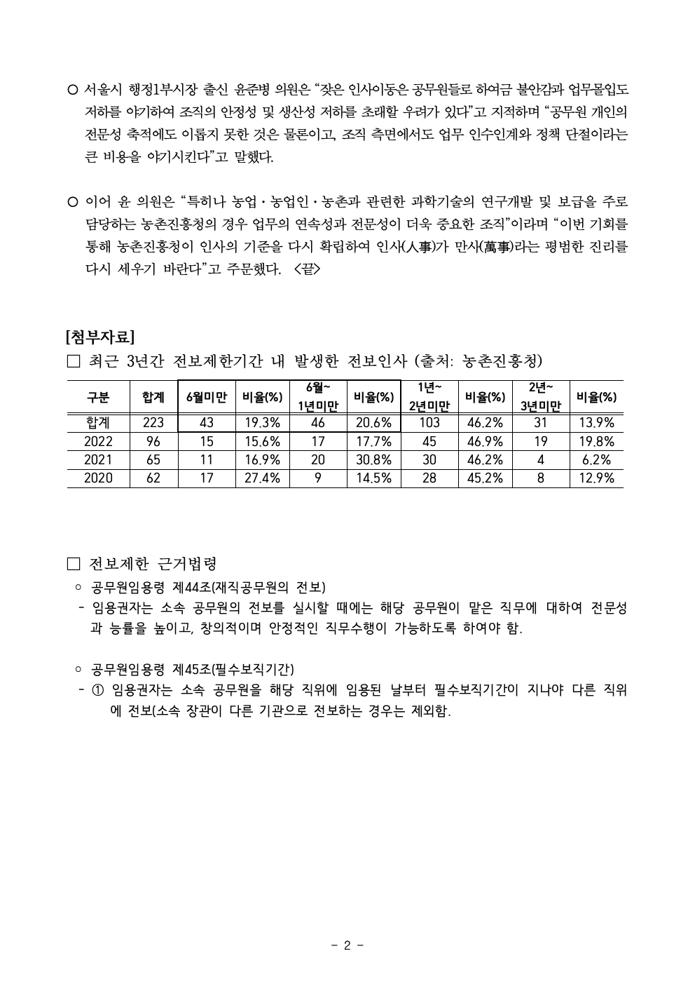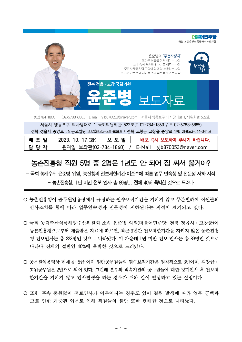 [윤준병의원 국정감사 보도자료]농촌진흥청 직원 5명 중 2명은 1년도 안 되어 짐 싸서 옮겨야