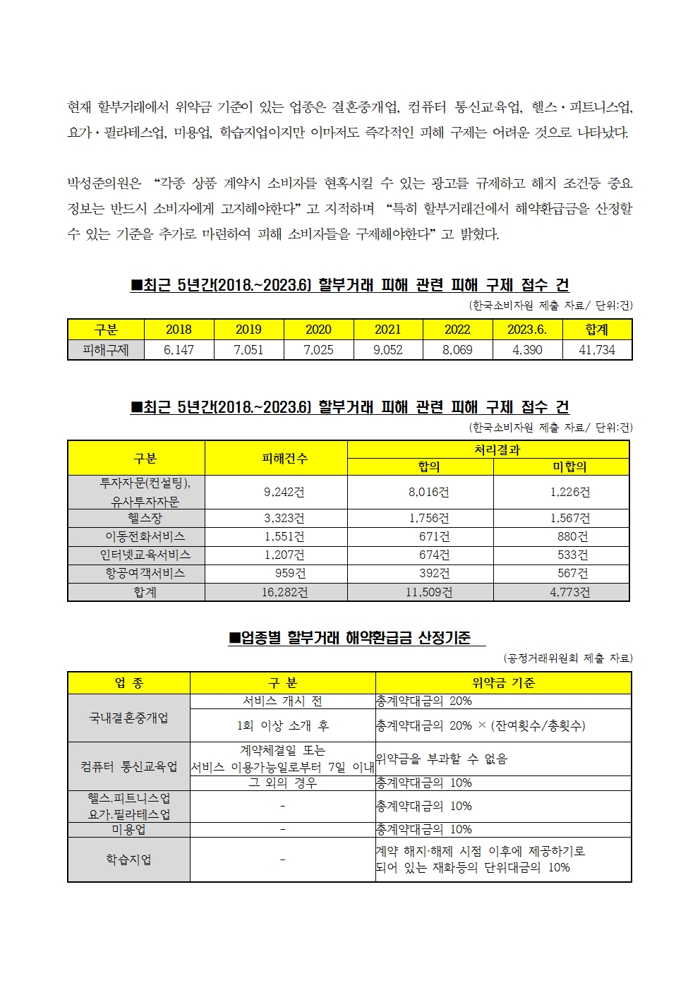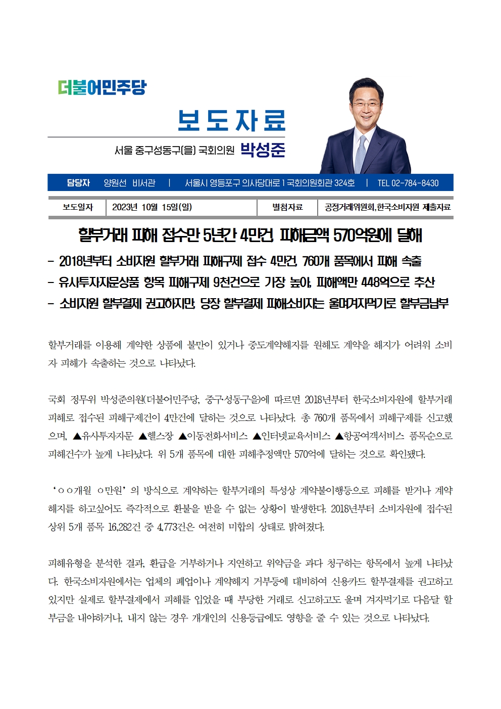 [국회의원 박성준_보도자료]231015_할부거래 피해 접수만 5년간 4만건 피해금액 570억원에 달해.hwp