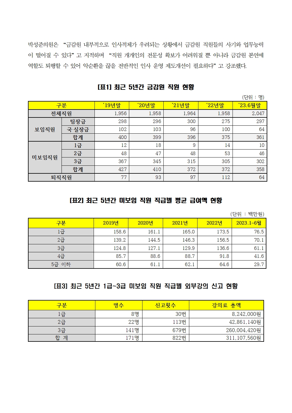 [국회의원 박성준_보도자료]231017_금감원 3급이상 상위직급 절반이 미보임직원 퇴직자는 해마다 증가.hwp
