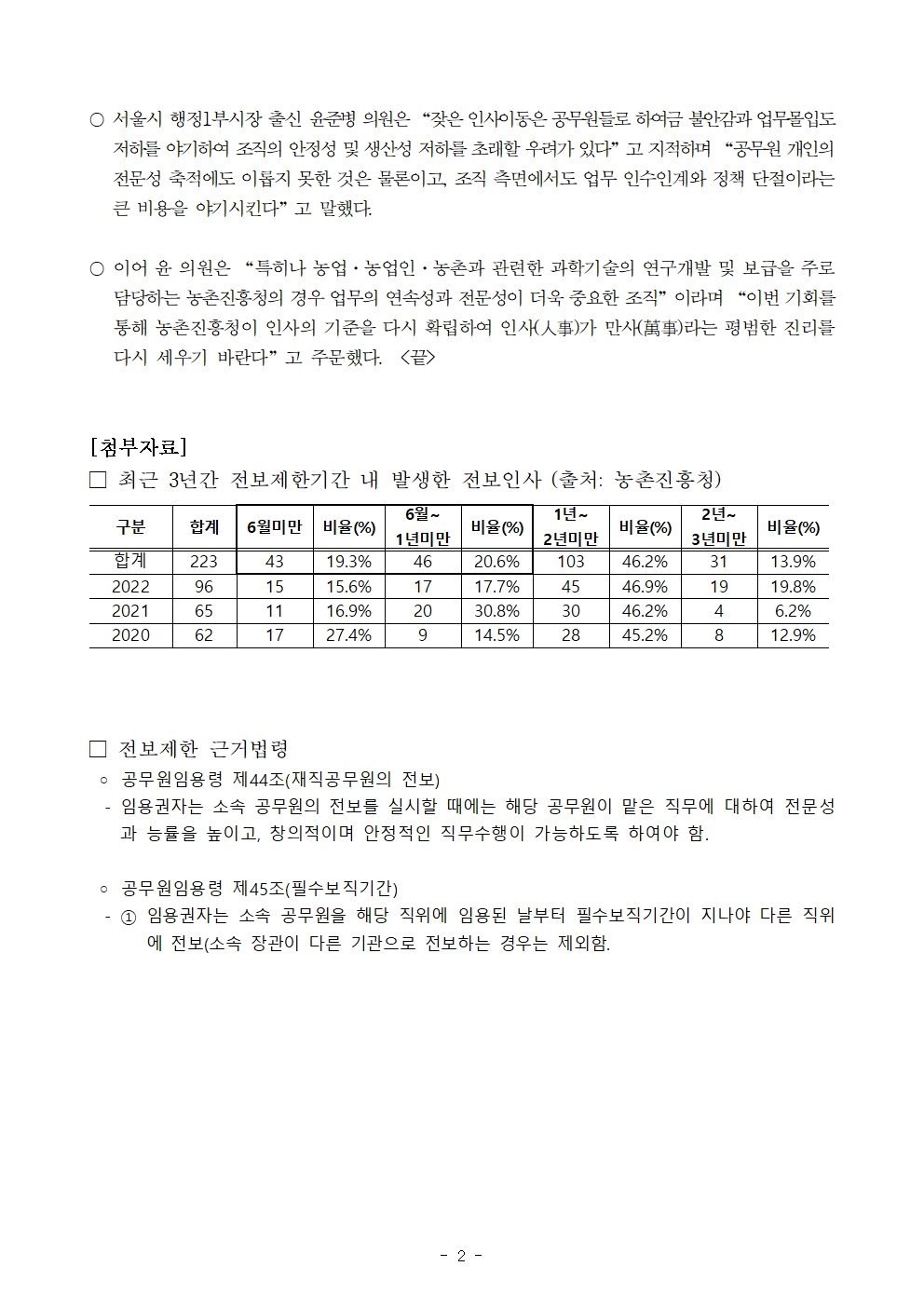 231017 [윤준병 의원 국정감사 보도자료] 농촌진흥청 직원 5명 중 2명은 1년도 안 되어 짐 싸서 옮겨야.hwp