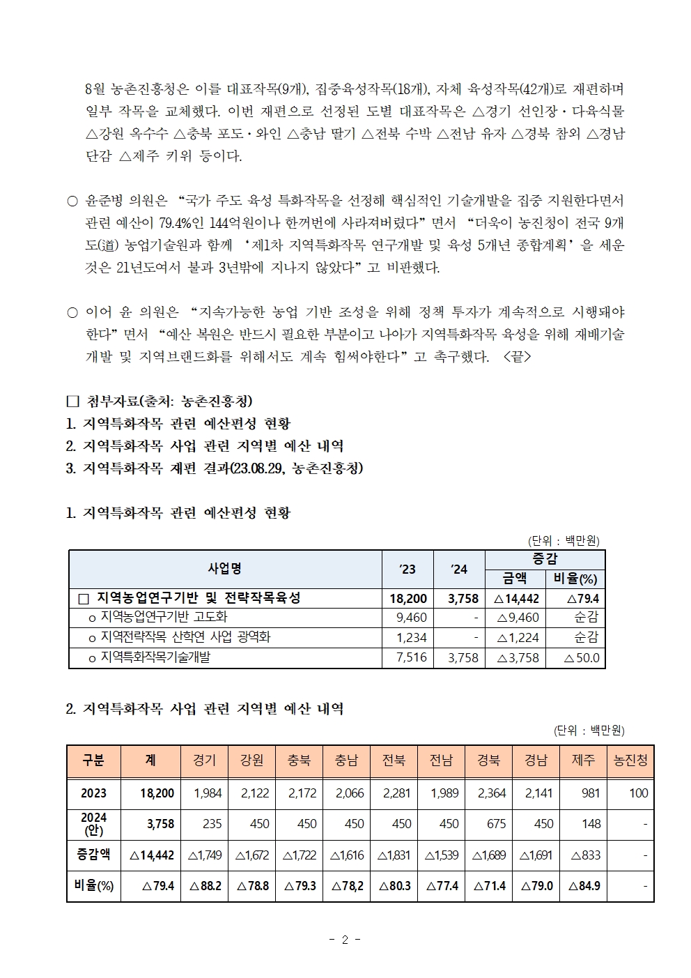 231018 [윤준병 의원 국정감사 보도자료] 윤준병 의원 농촌진흥청의 이율배반적인 지역특화작목 육성정책’ 비판.hwp