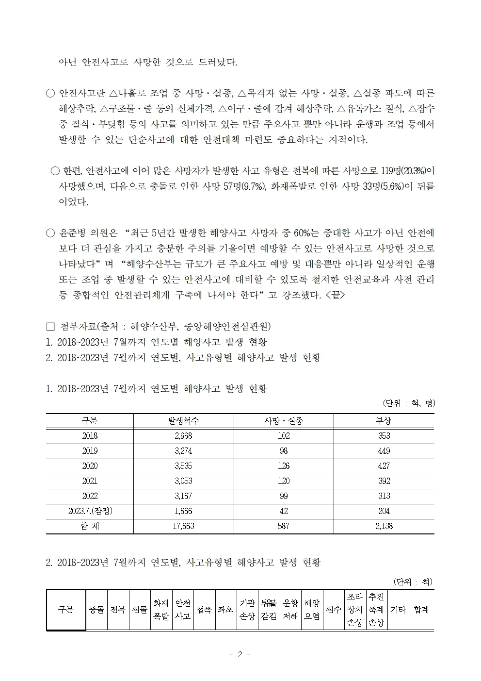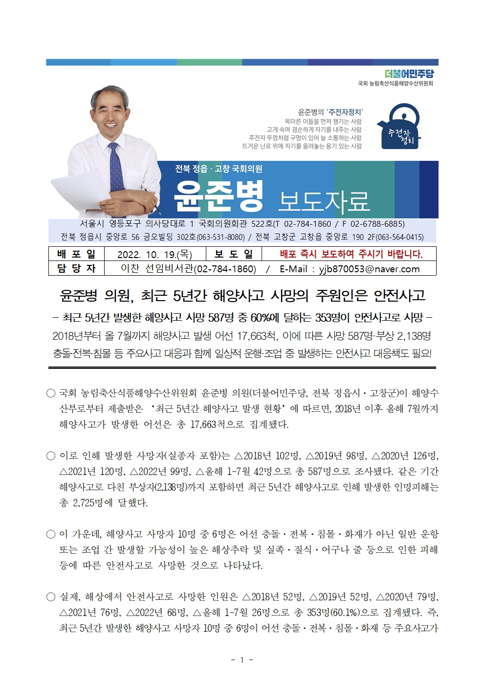 [윤준병 의원 국정감사 보도자료] 윤준병 의원, 최근 5년간 해양사고 사망의 주원인은 안전사고