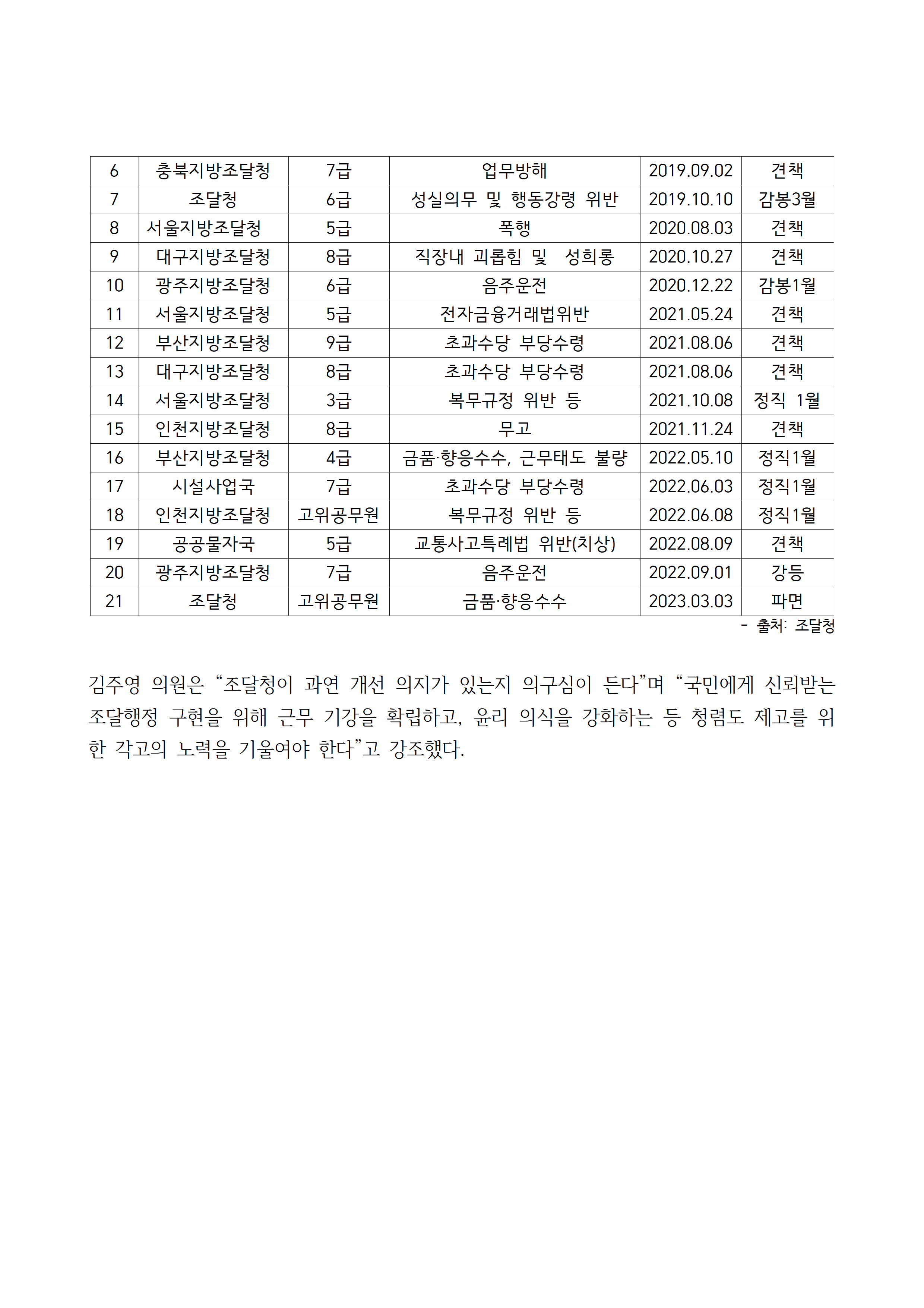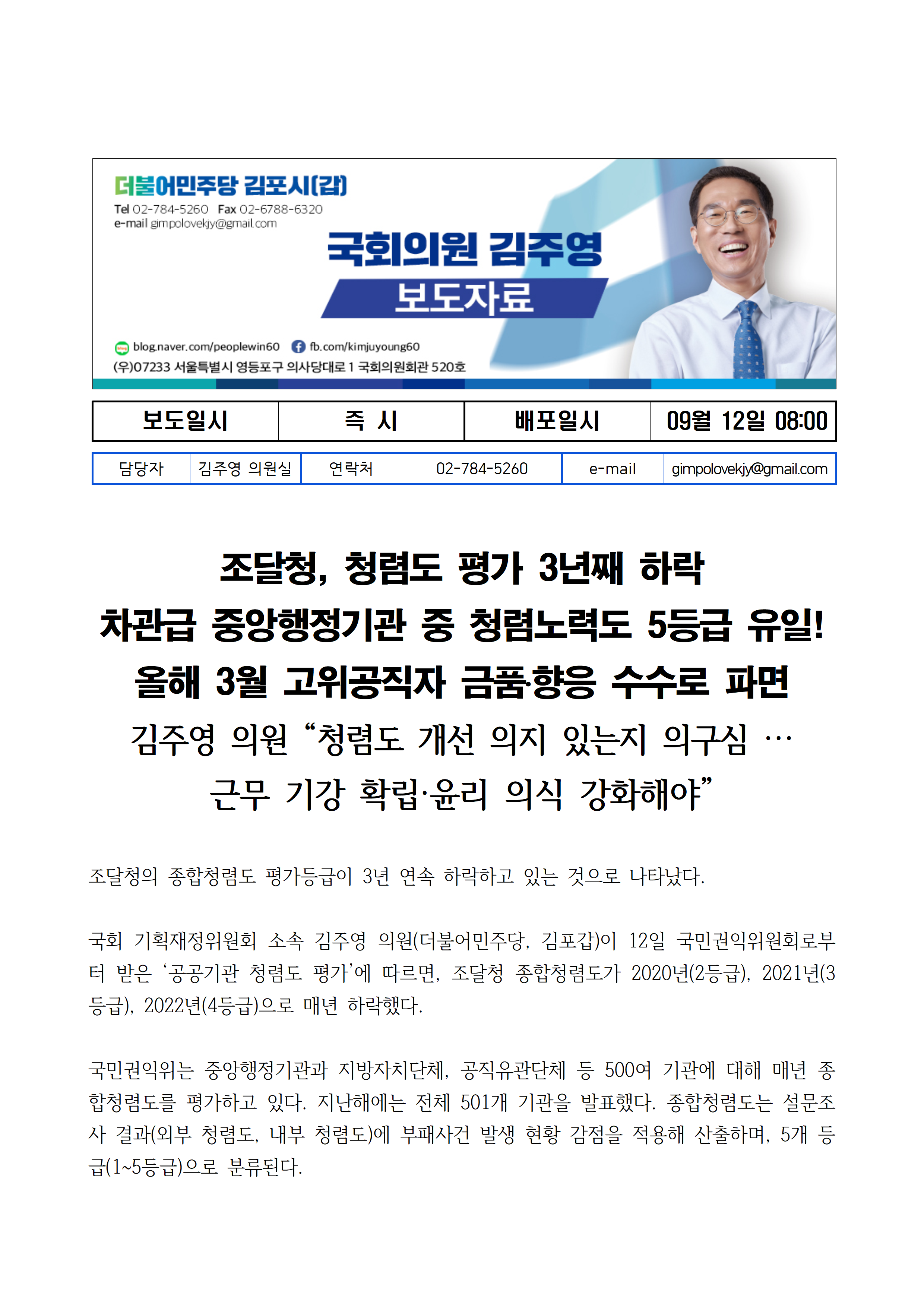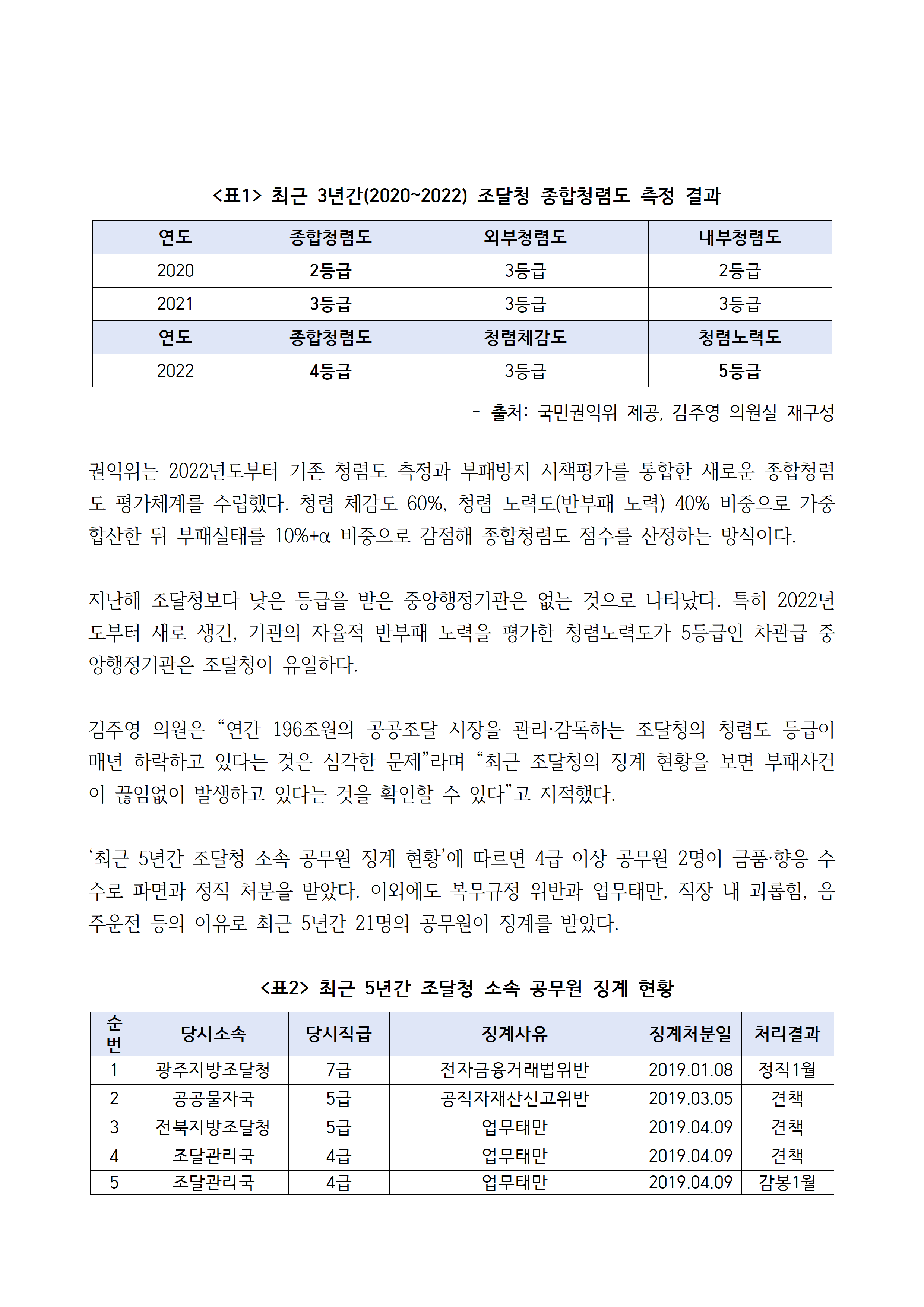 [김주영 의원 국감보도자료] 조달청, 청렴도 평가 3년째 하락 차관급 중앙행정기관 중 청렴노력도 5등급 유일! 올해 3월 고위공직자 금품․향응 수수로 파면