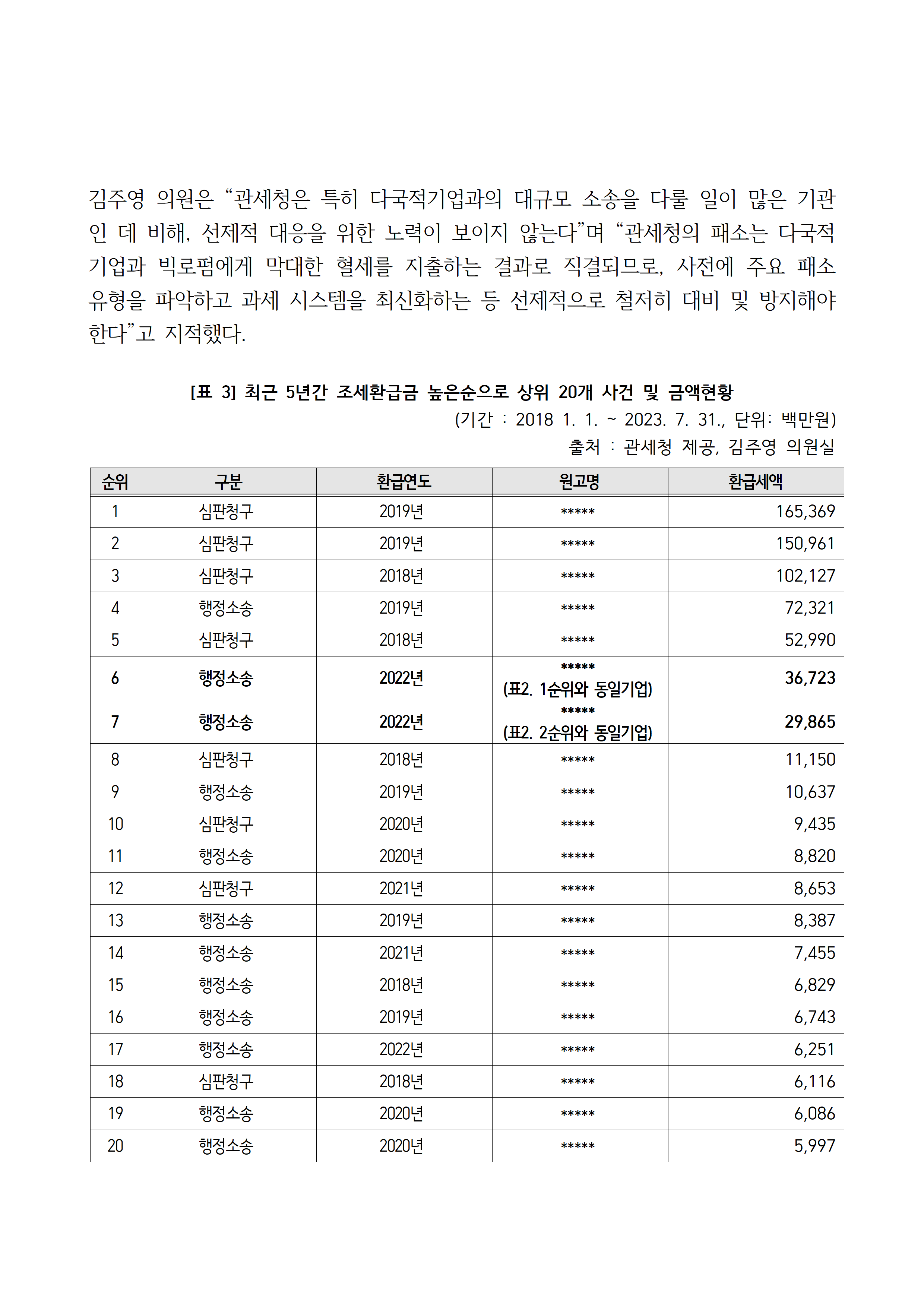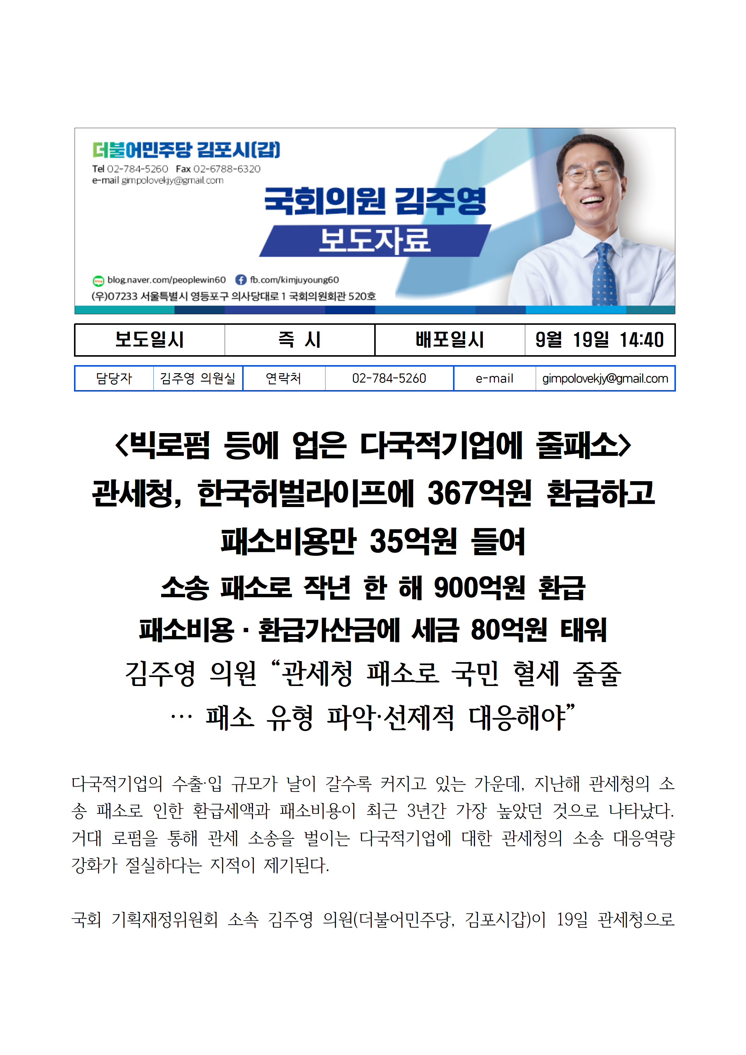 230919_국감보도자료_김주영_의원_관세청_빅로펌_업은_다국적기업에_줄패소_패소비용_혈세_샌다.hwp