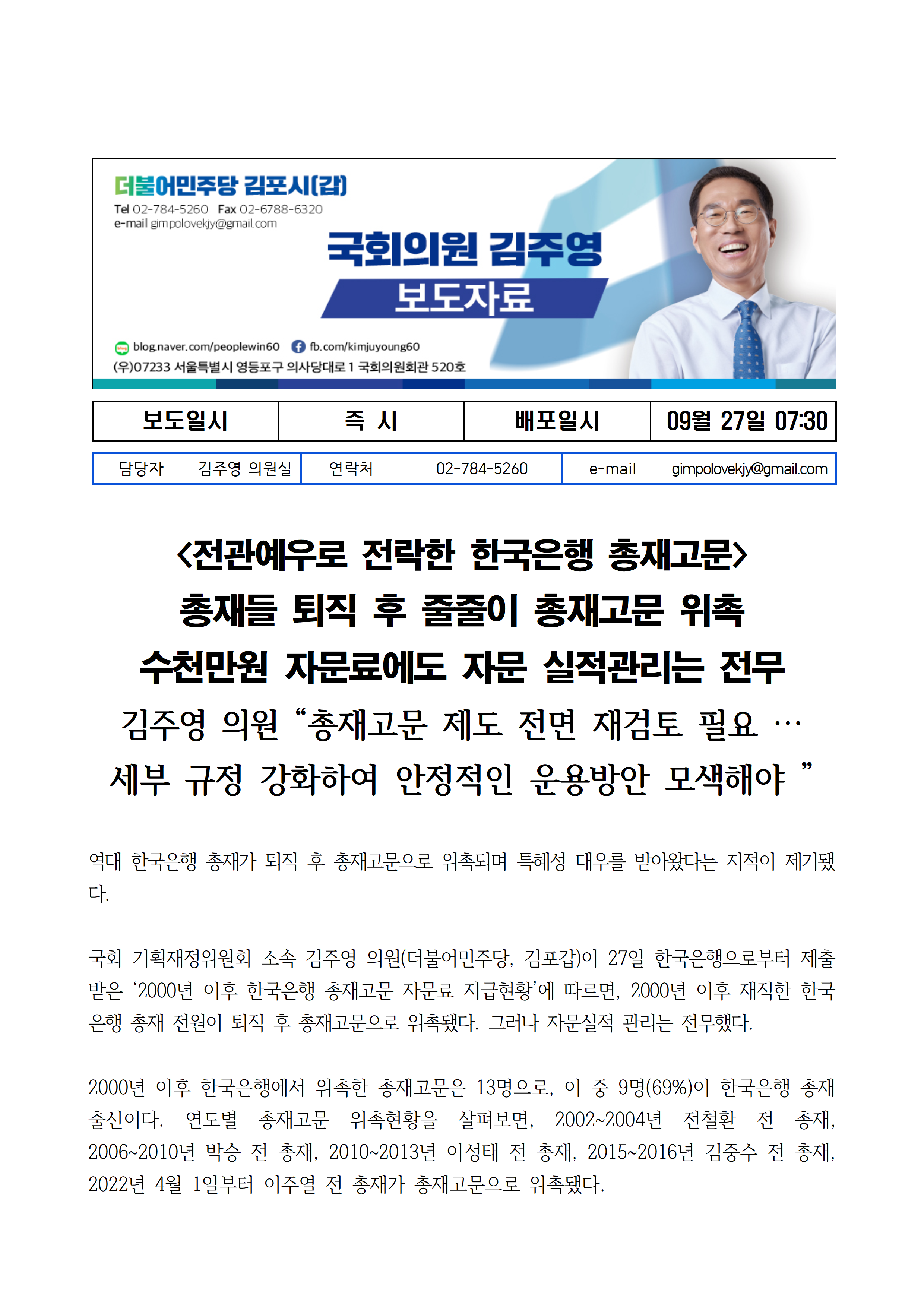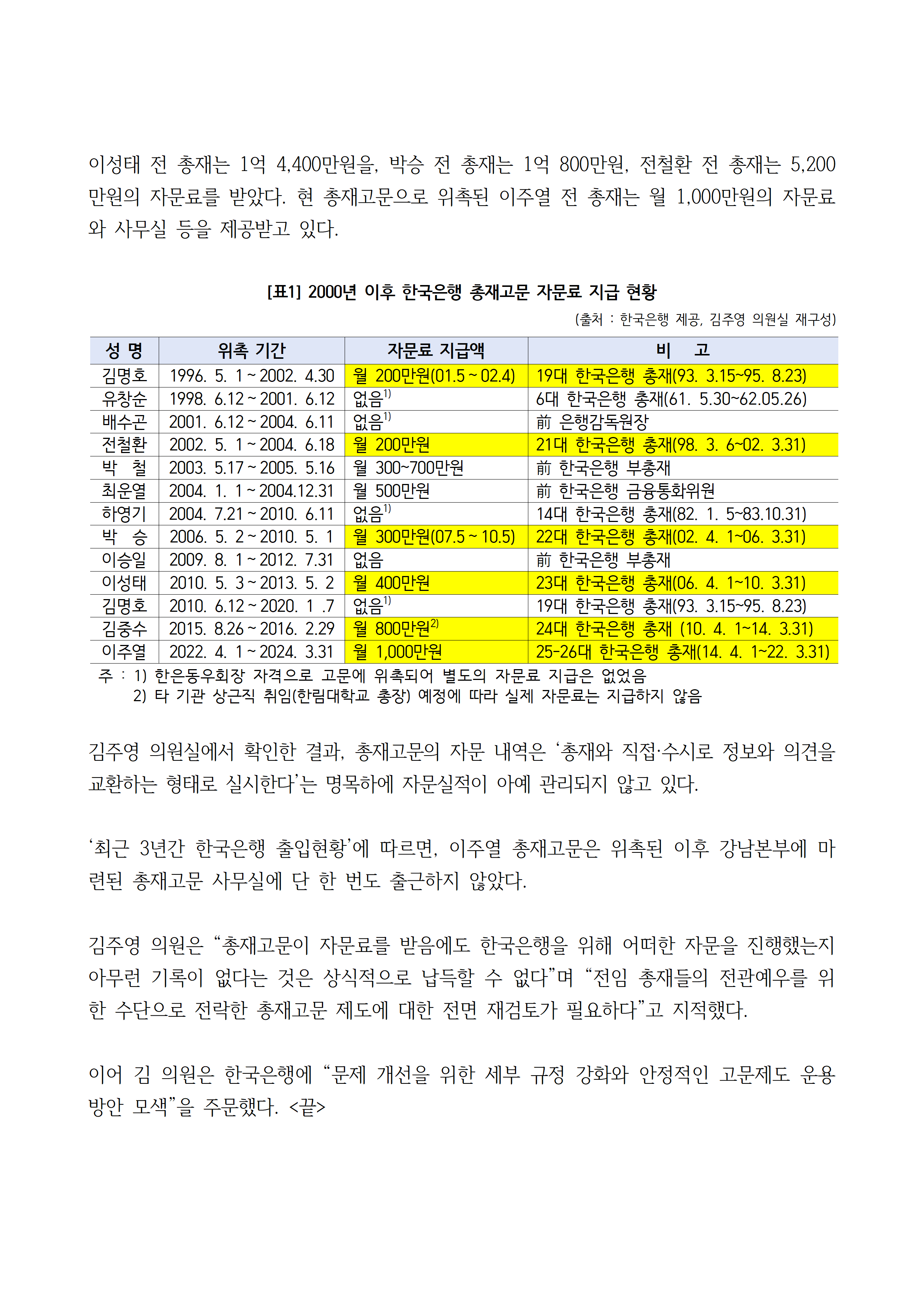 [김주영 의원 국감보도자료] <전관예우로 전락한 한국은행 총재고문> 총재들 퇴직 후 줄줄이 총재고문 위촉 수천만원 자문료에도 자문 실적관리는 전무