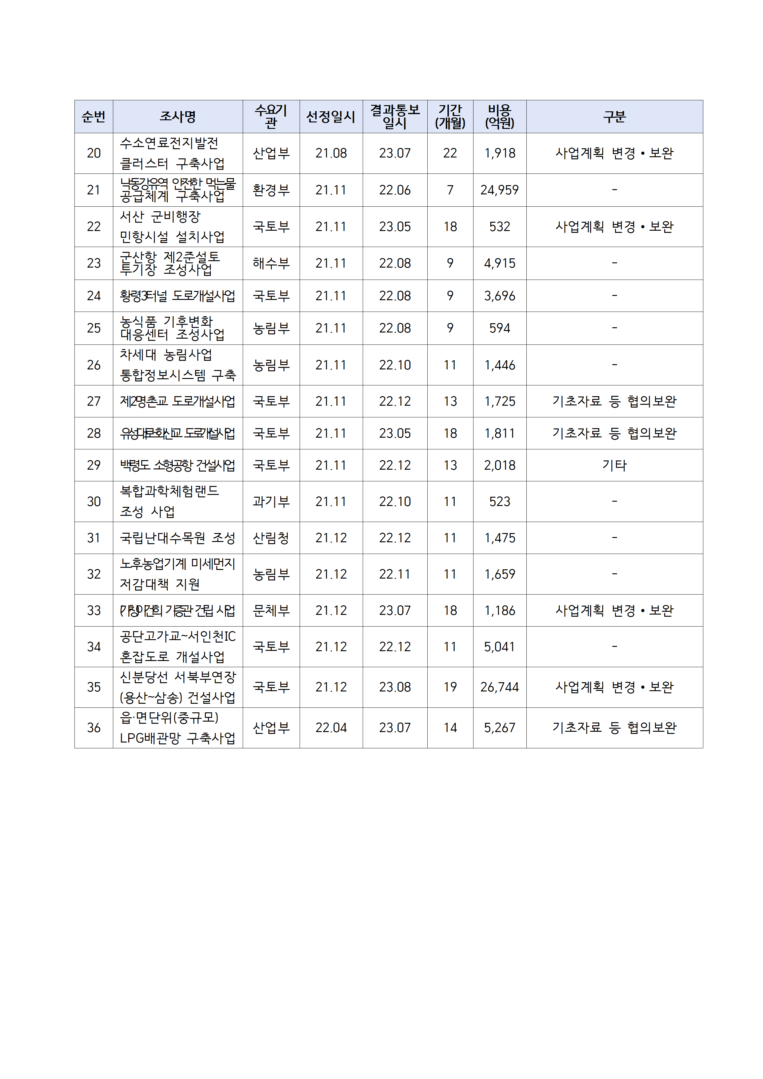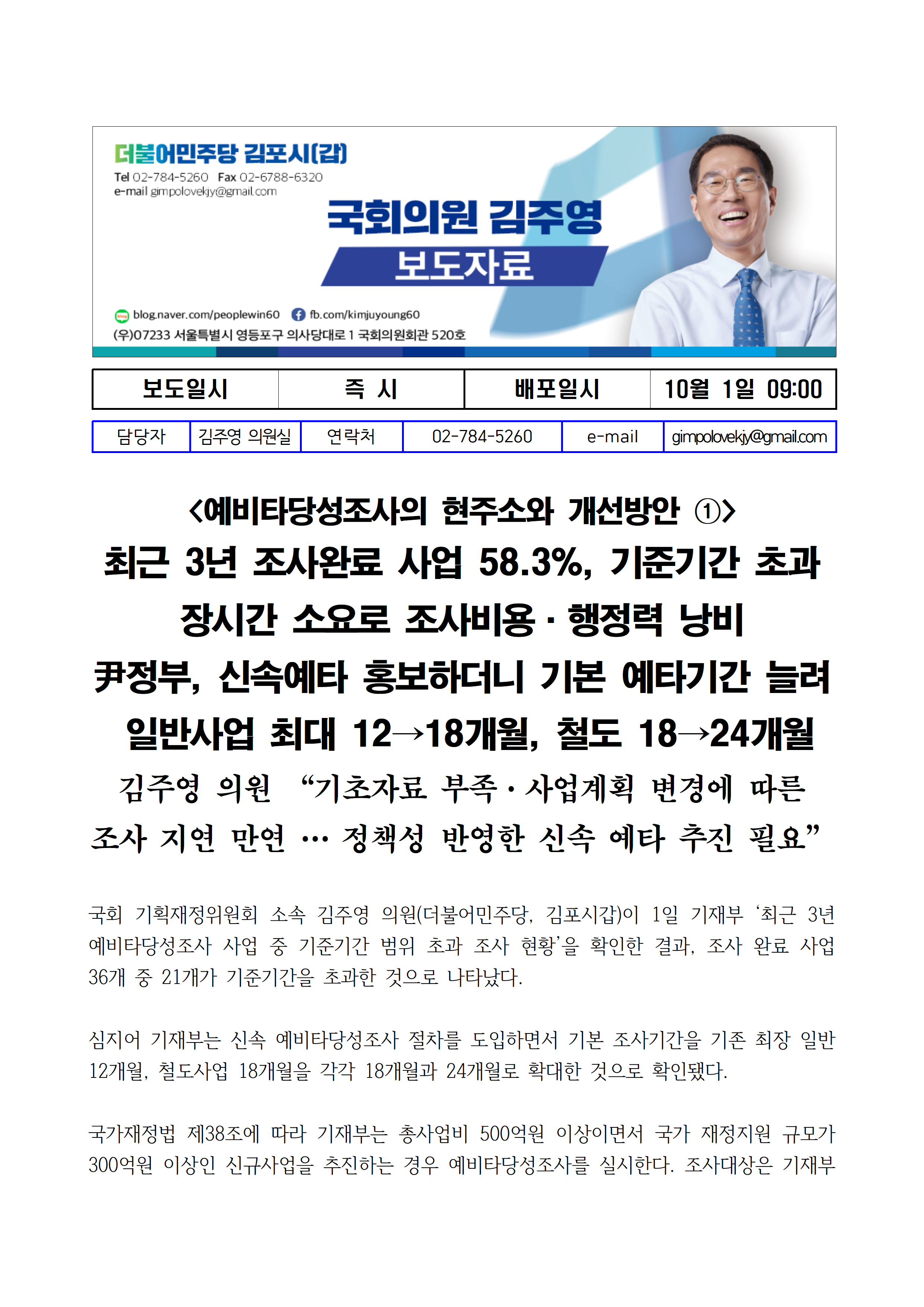 [김주영 의원 국감보도자료] <예비타당성조사의 현주소와 개선방안 ①> 최근 3년 조사완료 사업 58.3%, 기준기간 초과 장시간 소요로 조사비용·행정력 낭비 尹정부