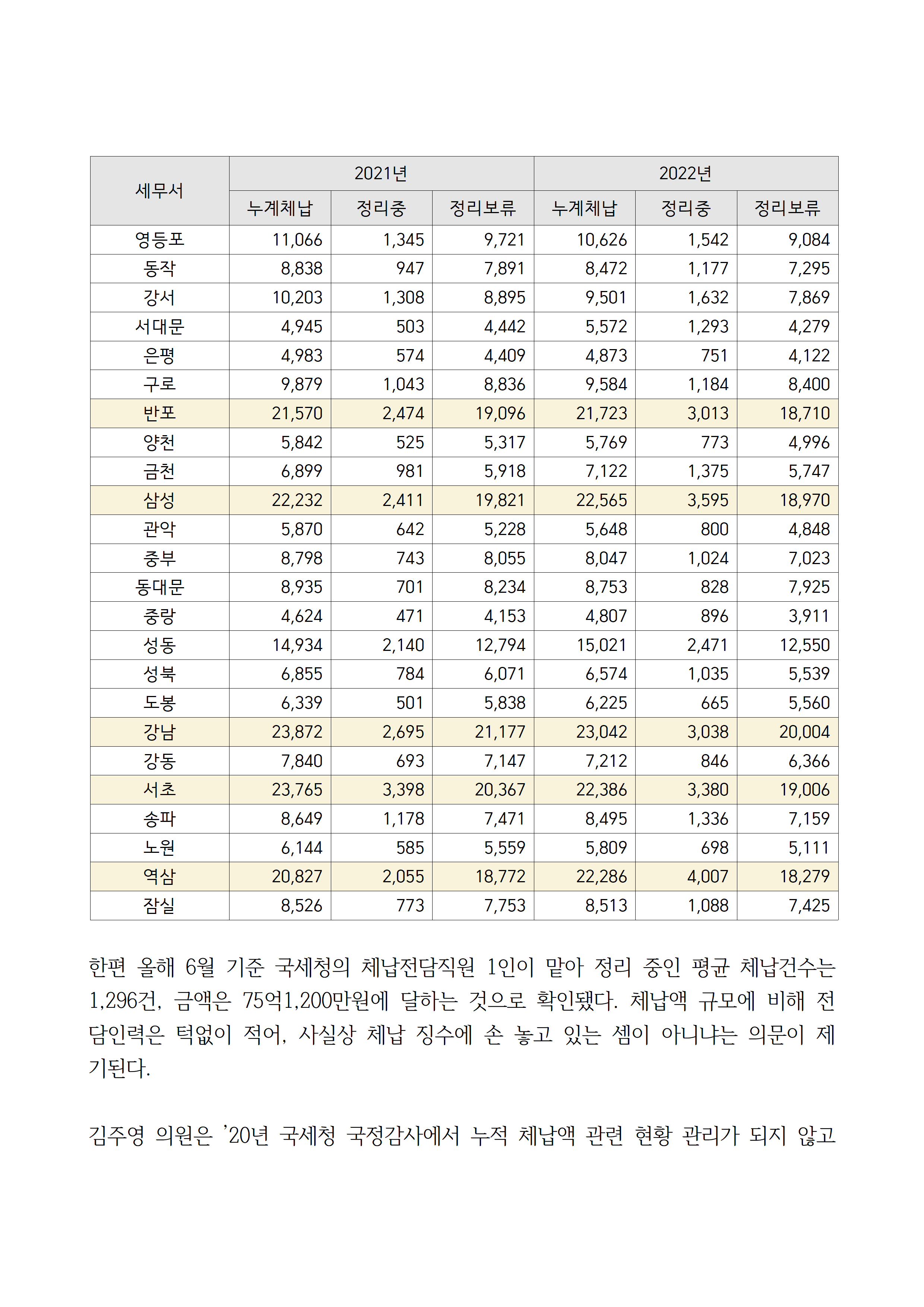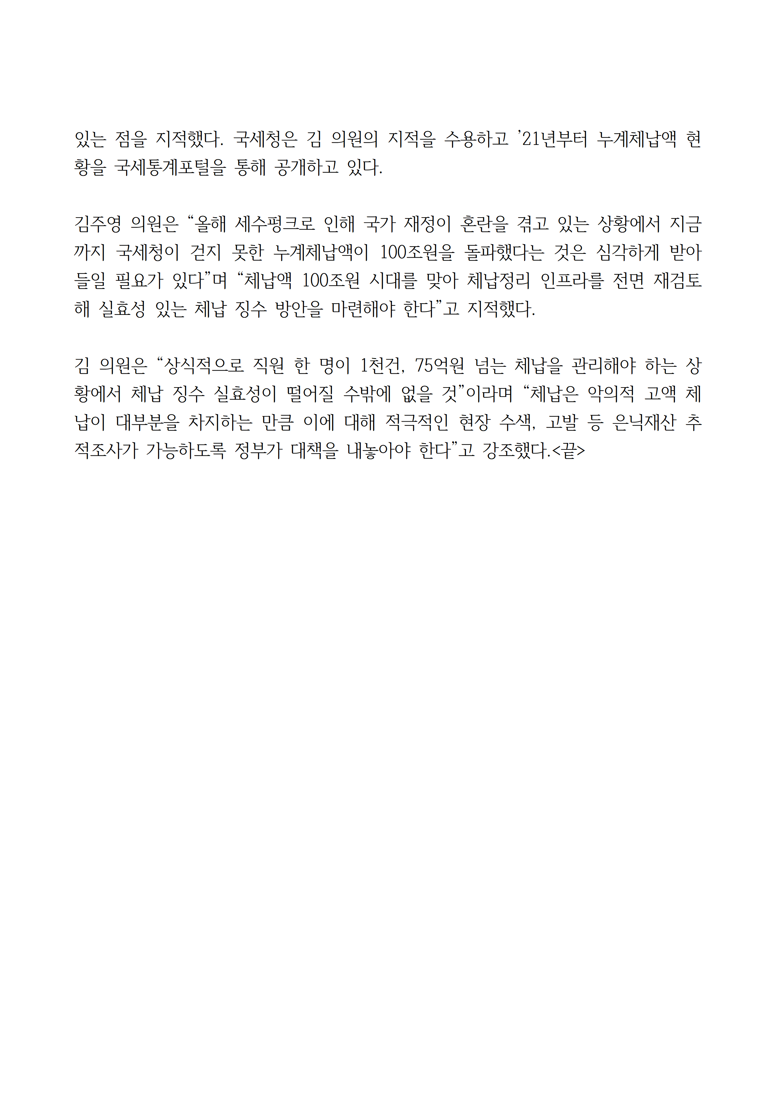 231002_국감보도자료_김주영_의원_국세청_작년_누계체납액_최초로_100조원_돌파했는데_체납전담직원_1인당_75억원.hwp
