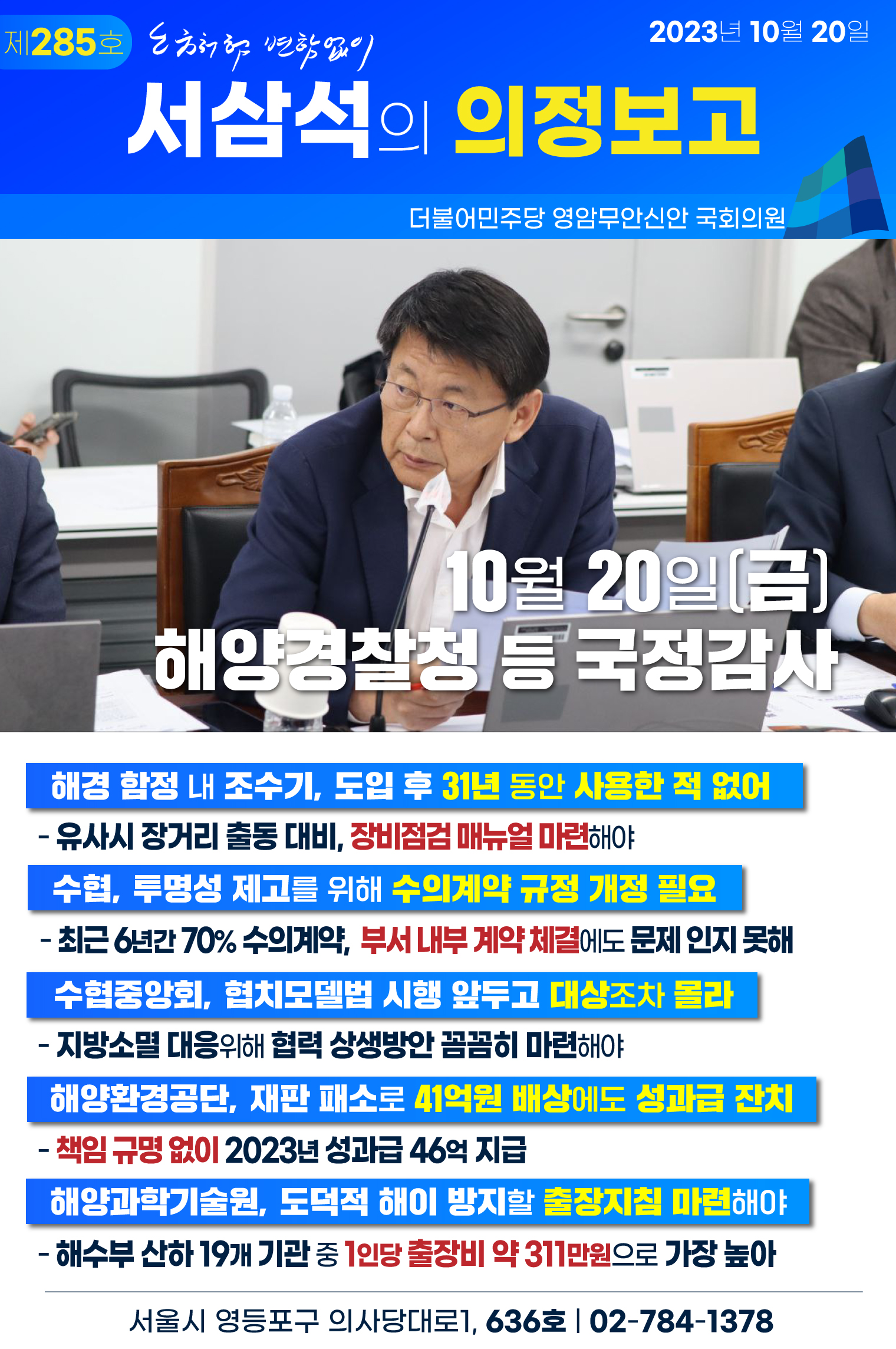 [서삼석 국회의원]231020_서삼석,"해경 선박, 식수 확보 위해 구입한 조수기 사용실적 전무"
