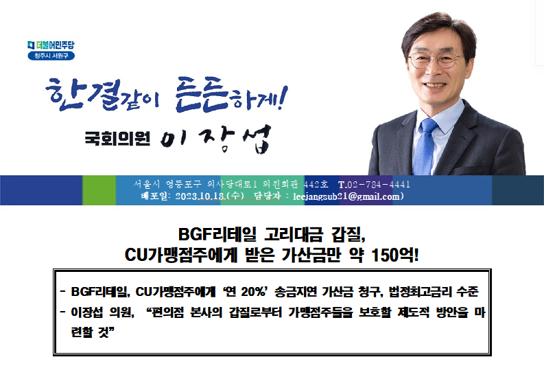 이장섭의원_231018_BGF리테일 고리대금 갑질, CU가맹점주에게 받은 가산금만 약 150억!