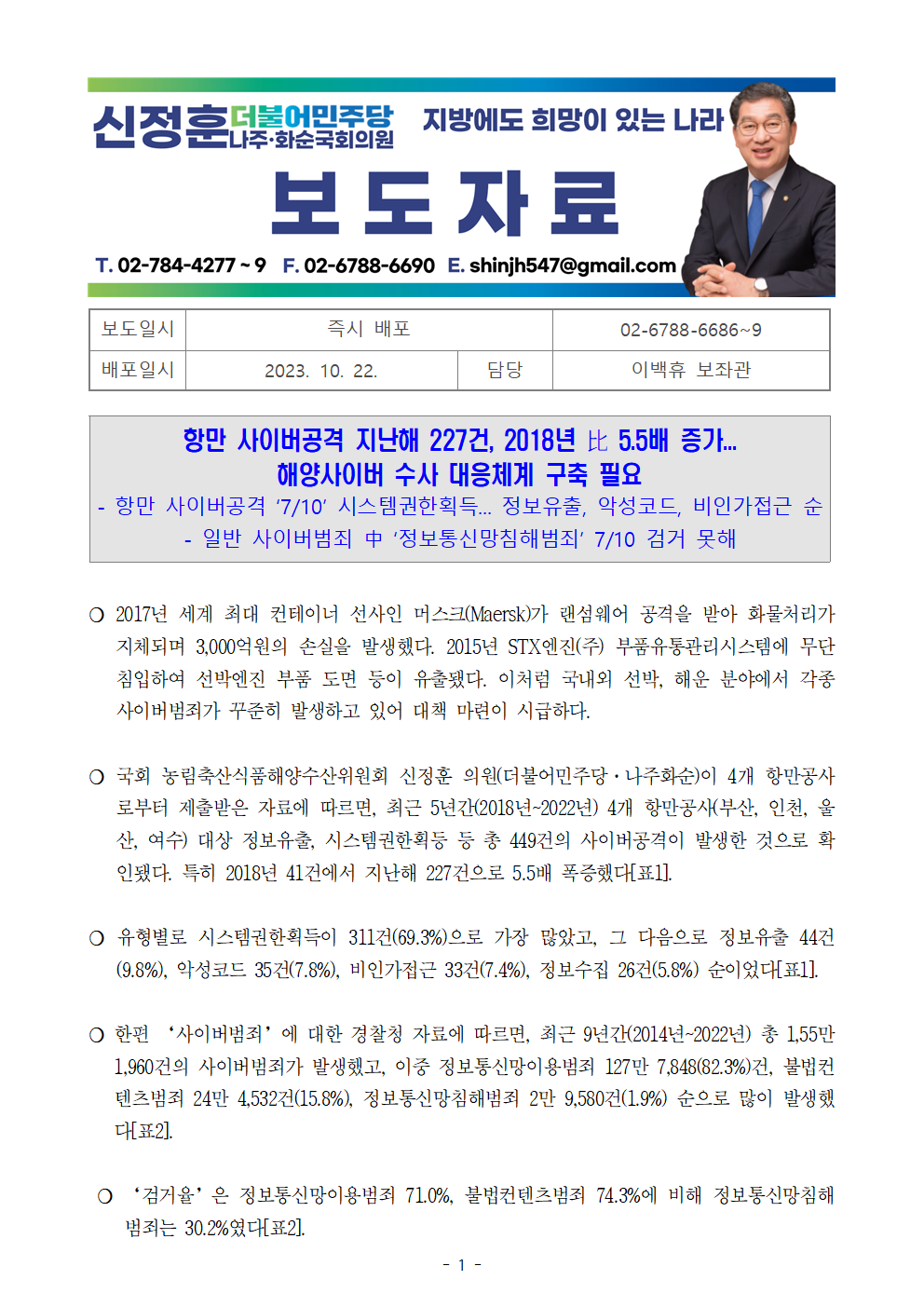 [신정훈 의원 보도자료] 항만 사이버공격 지난해 227건, 2018년 比 5.5배 증가... 해양사이버 수사 대응체계 구축 필요