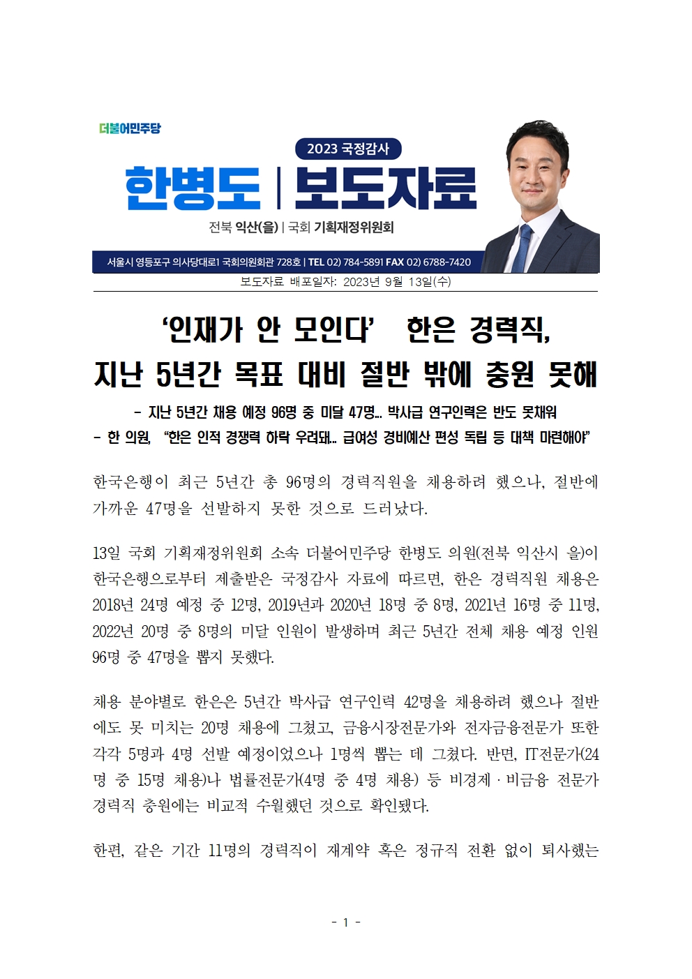 [국회의원 한병도 국감 보도자료] ‘인재가 안 모인다’ 한은 경력직, 지난 5년간 목표 대비 절반 밖에 충원 못해