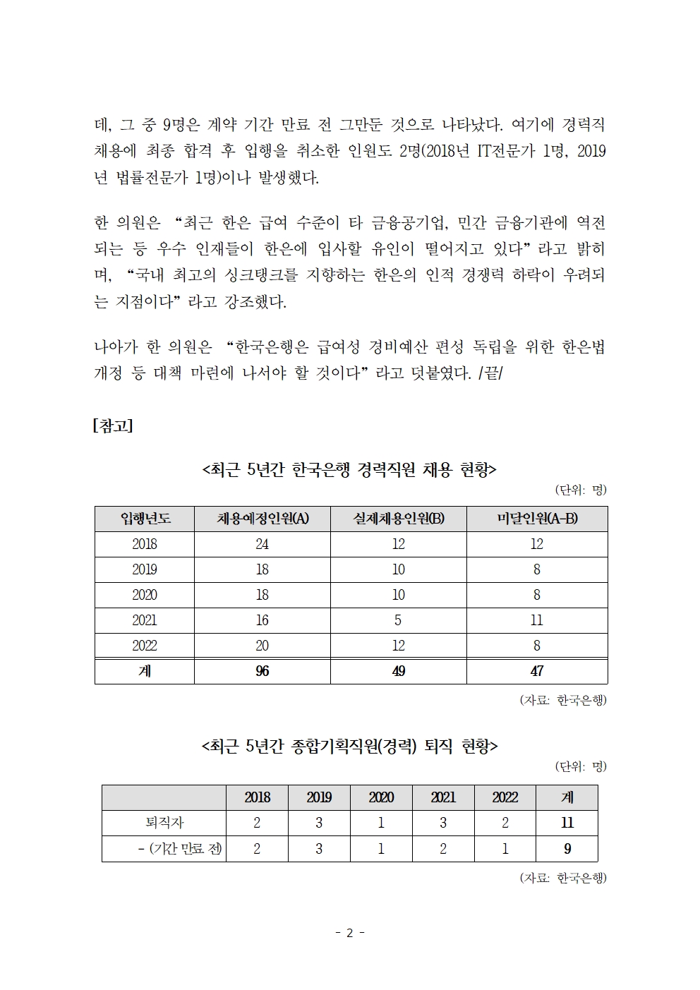 [한병도의원]2023기재위국정감사보도자료(10)_‘인재가 안 모인다’ 한은 경력직 지난 5년간 목표 대비 절반 밖에 충원 못해.hwp