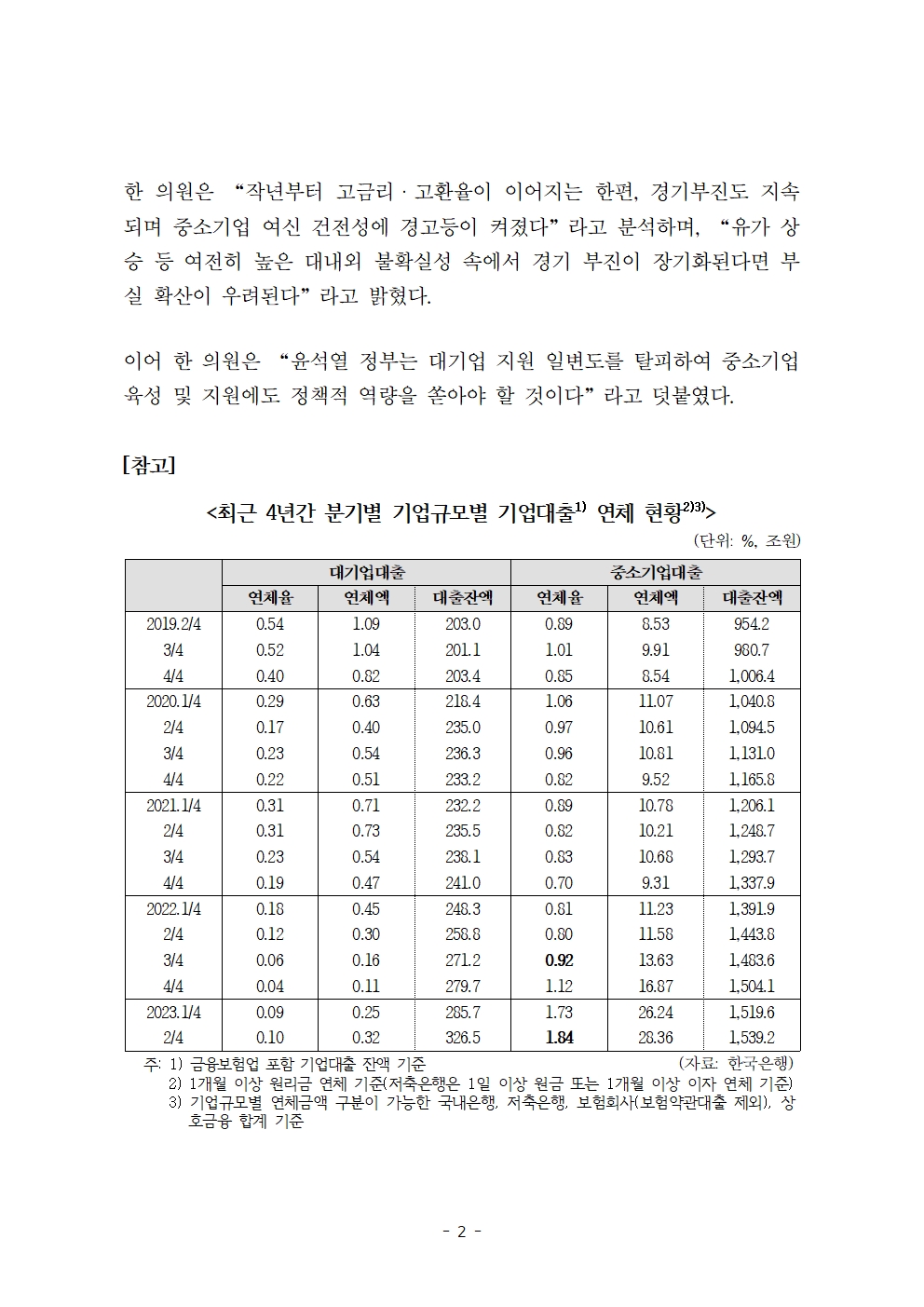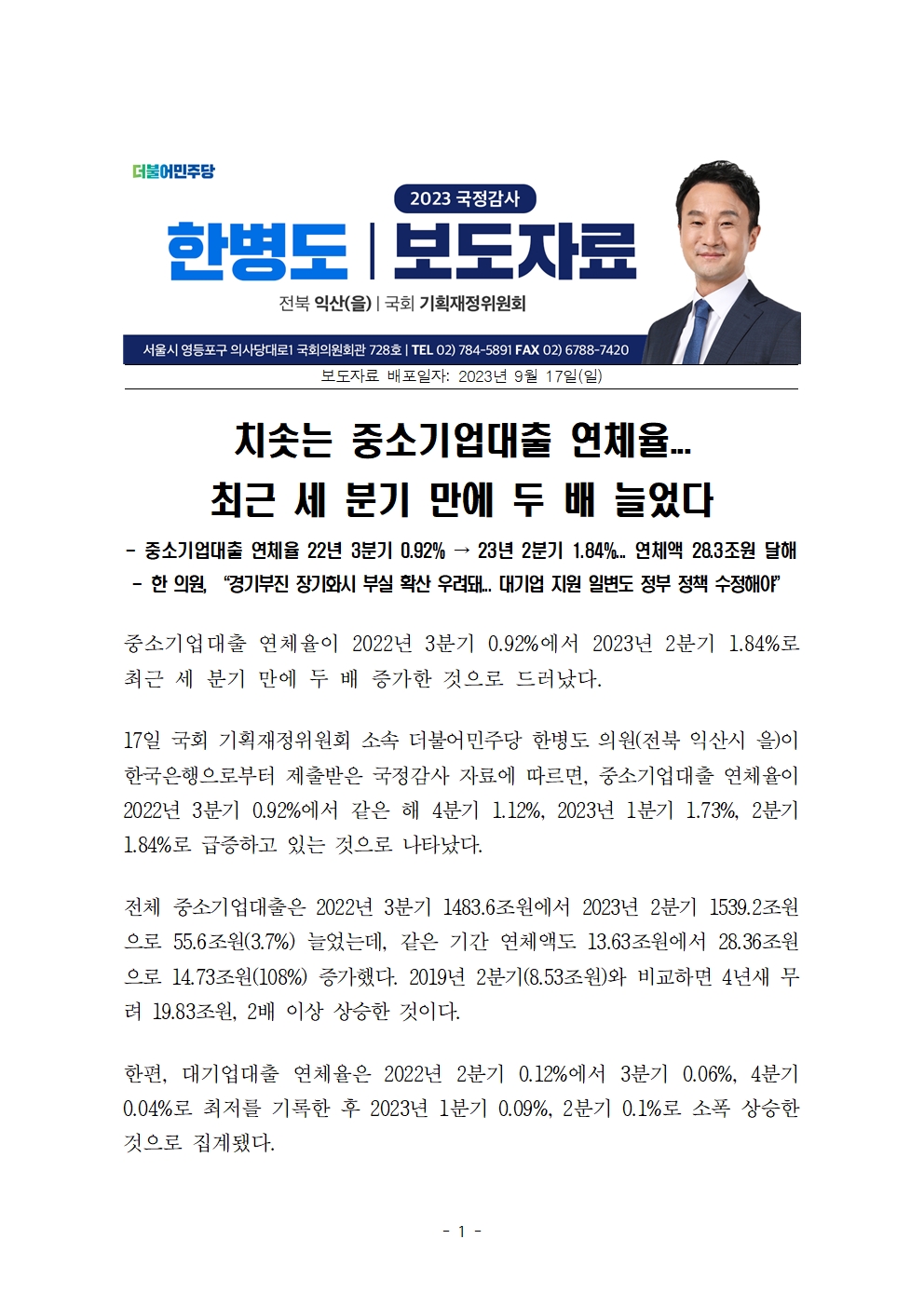 [한병도의원]2023기재위국정감사보도자료(12)_치솟는 중소기업대출 연체율... 최근 세 분기 만에 두 배 늘었다.hwp