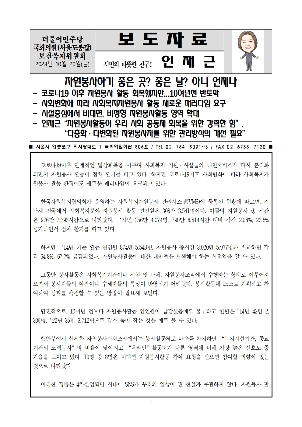 231020_[인재근의원실 보도자료] 자원봉사 하기 좋은 곳_ 좋은 날_ 아니 언제나.hwp