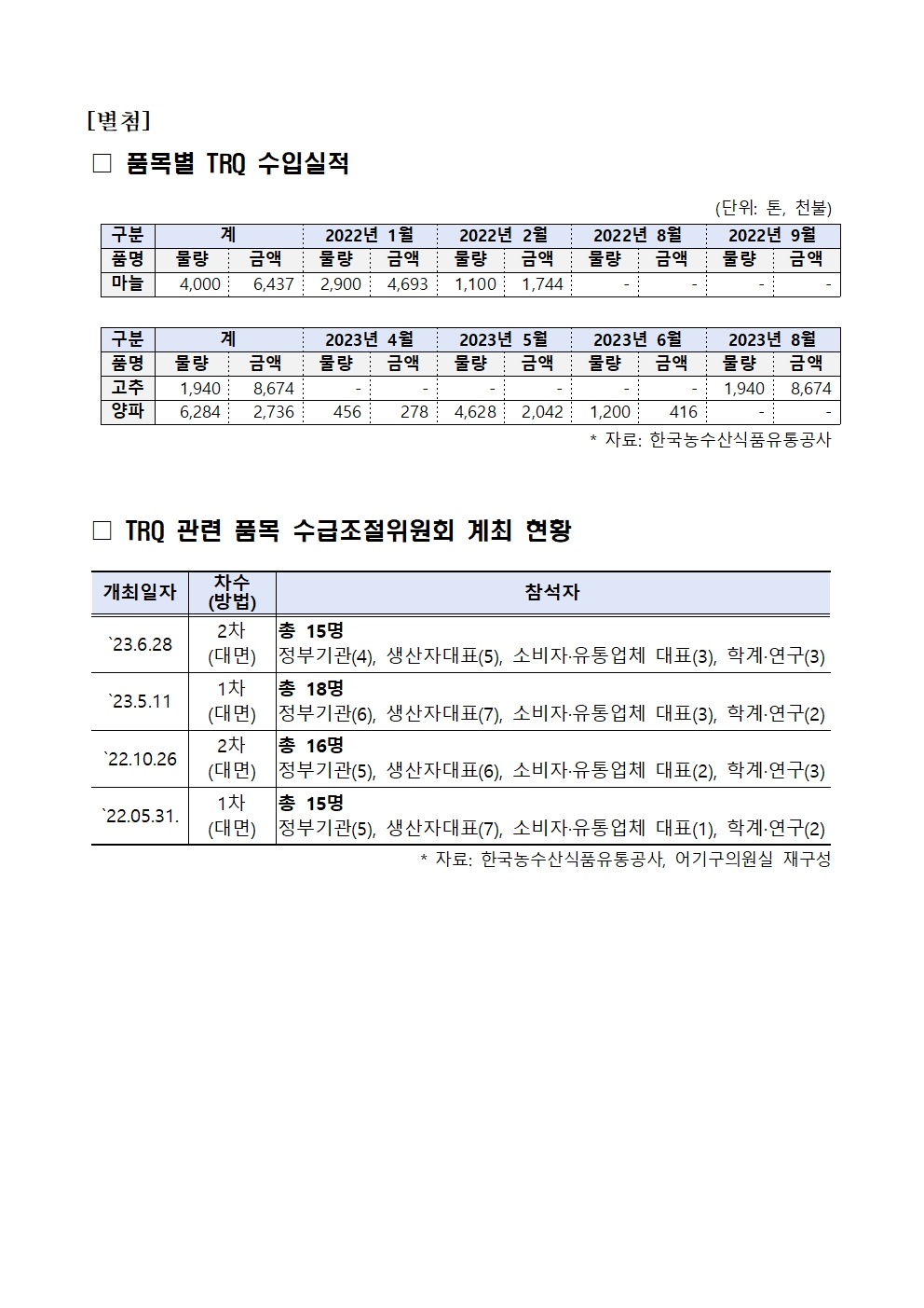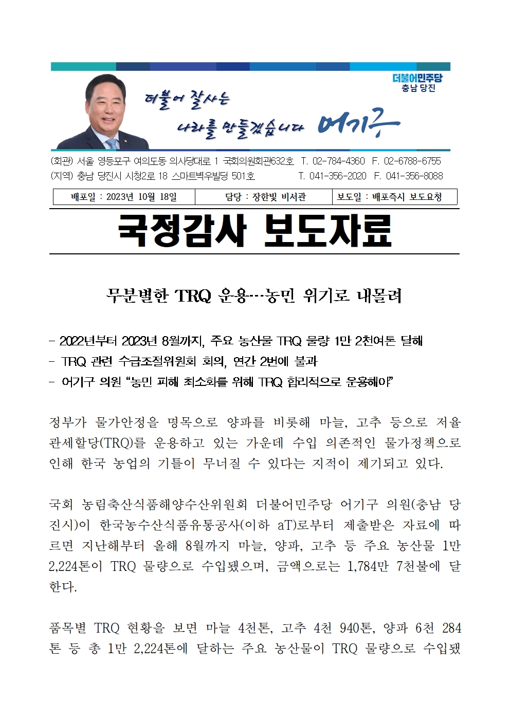 231018 [어기구의원 국정감사 보도자료] 무분별한 TRQ 운용…농민 위기로 내몰려.hwp