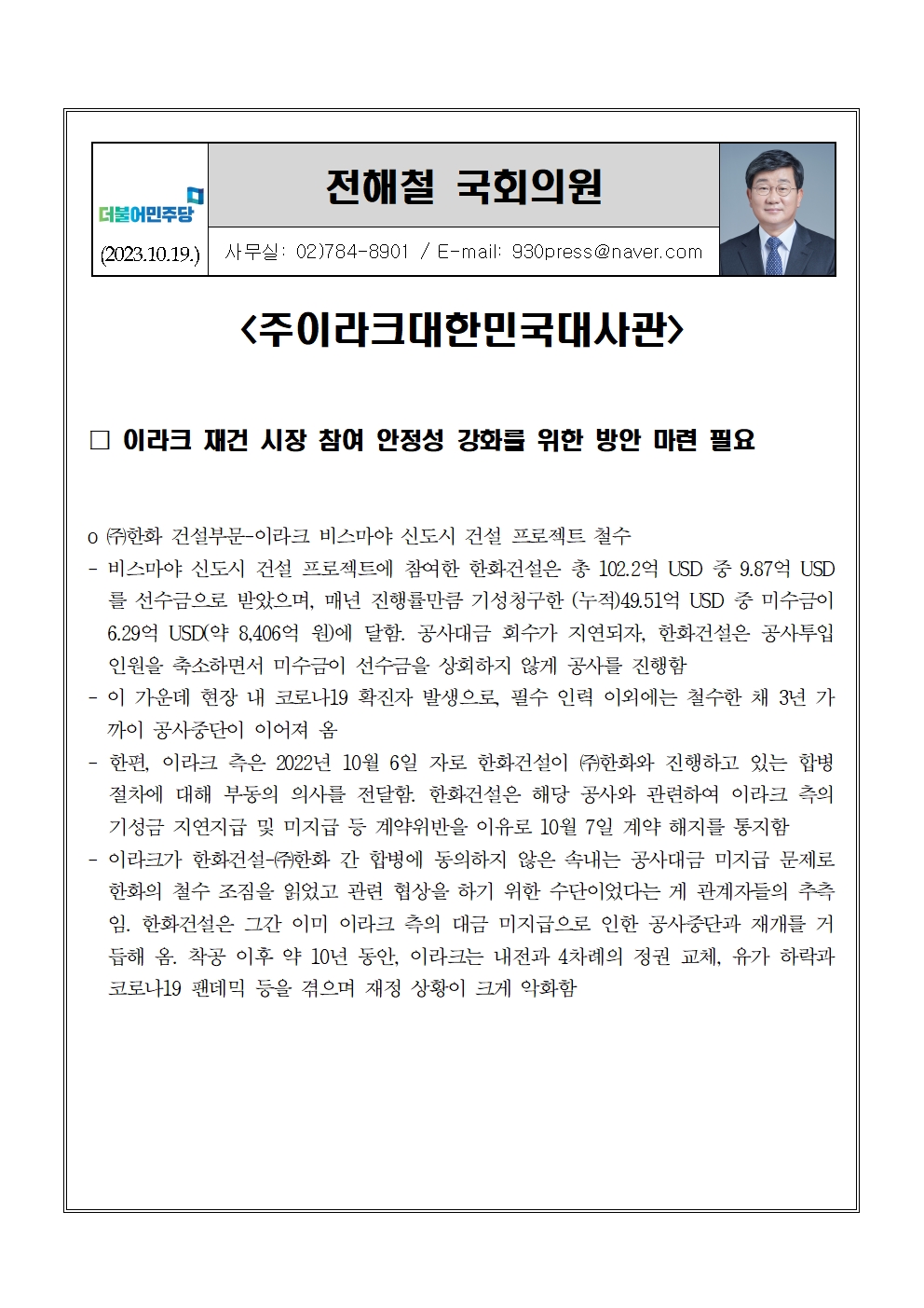 [전해철의원실 국정감사 보도자료] 이라크 재건 시장 참여 안정성 강화를 위한 방안 마련 필요 (23.10.19).hwp