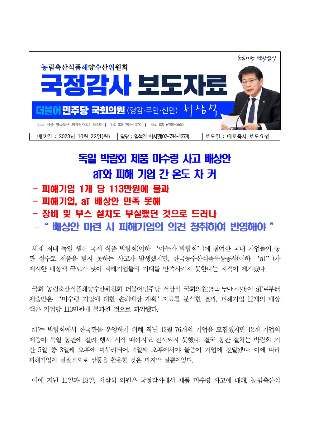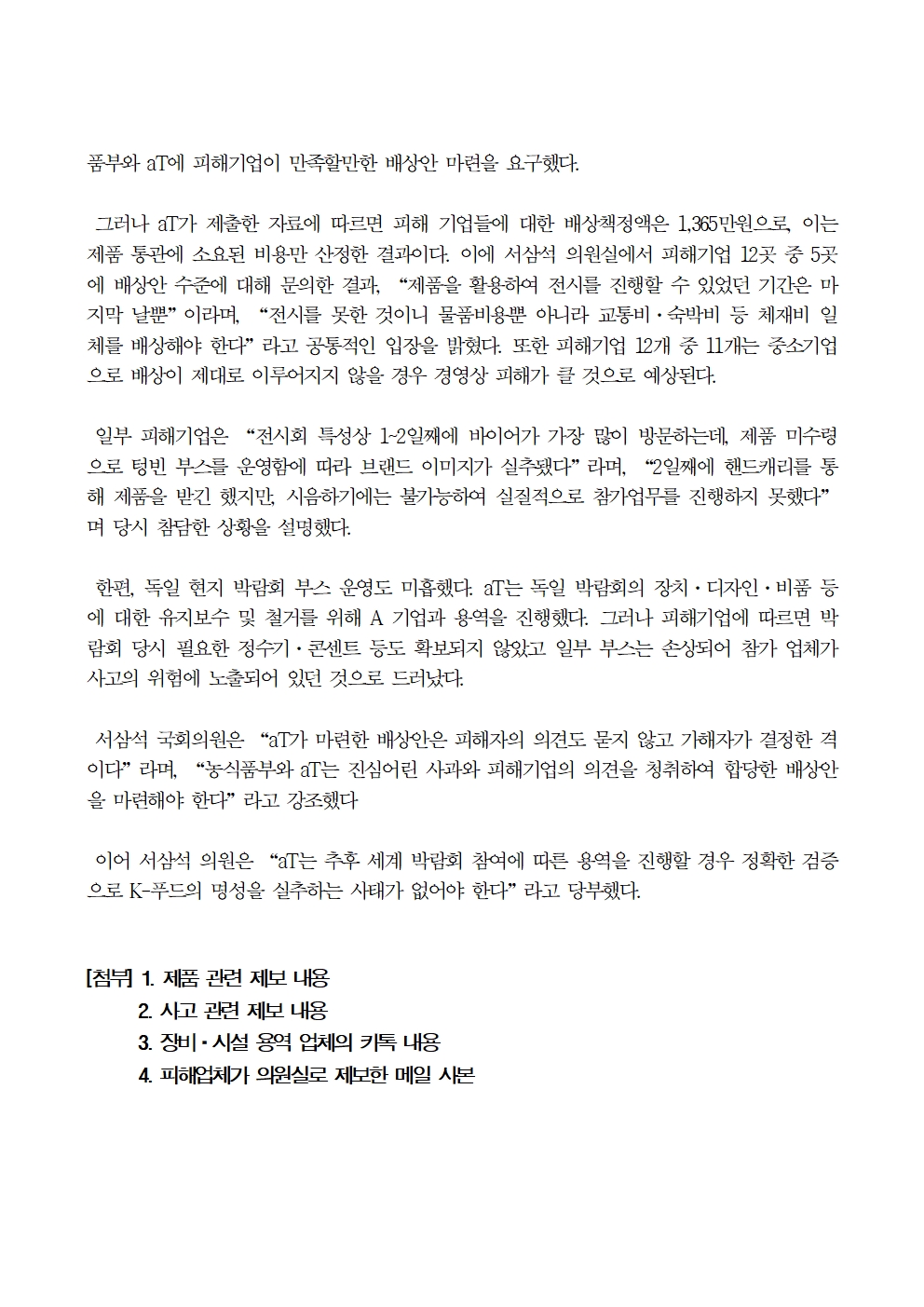[서삼석 국회의원] 231023_aT, 피해 기업에 대한 보상은 113만원 수준 4안