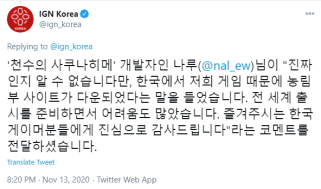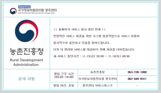 <그림> 2020년 11월 12일 천수의 사쿠나히메 출시 직후 농촌진흥청 사이트 접속 제한