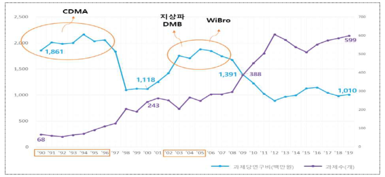 ETRI가 자체 분석한 자료에 따르면, 1990년부터 2020년까지 ETRI의 과제수는 68개에서 599개로 8.8배 증가한 반면, 과제당 연구비는 절반수준인 18.6억에서 10.6억까지 감소했다. 여기에 통계청 물가변동까지 감안하면 약 5.5억으로 1/4수준으로 떨어진다.