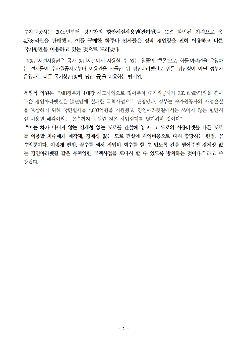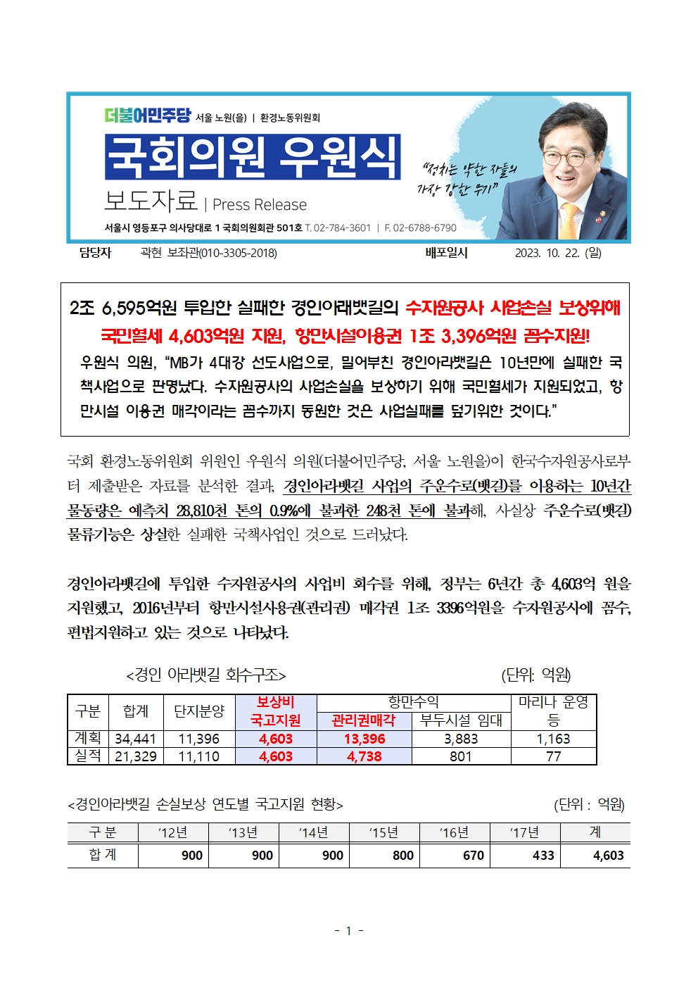 [우원식의원 보도자료] 2조 6,595억원 투입한 실패한 경인아래뱃길의 수자원공사 사업손실 보상위해 국민혈세 4,603억원 지원, 항만시설이용권 1조 3,396억원 꼼수지원!