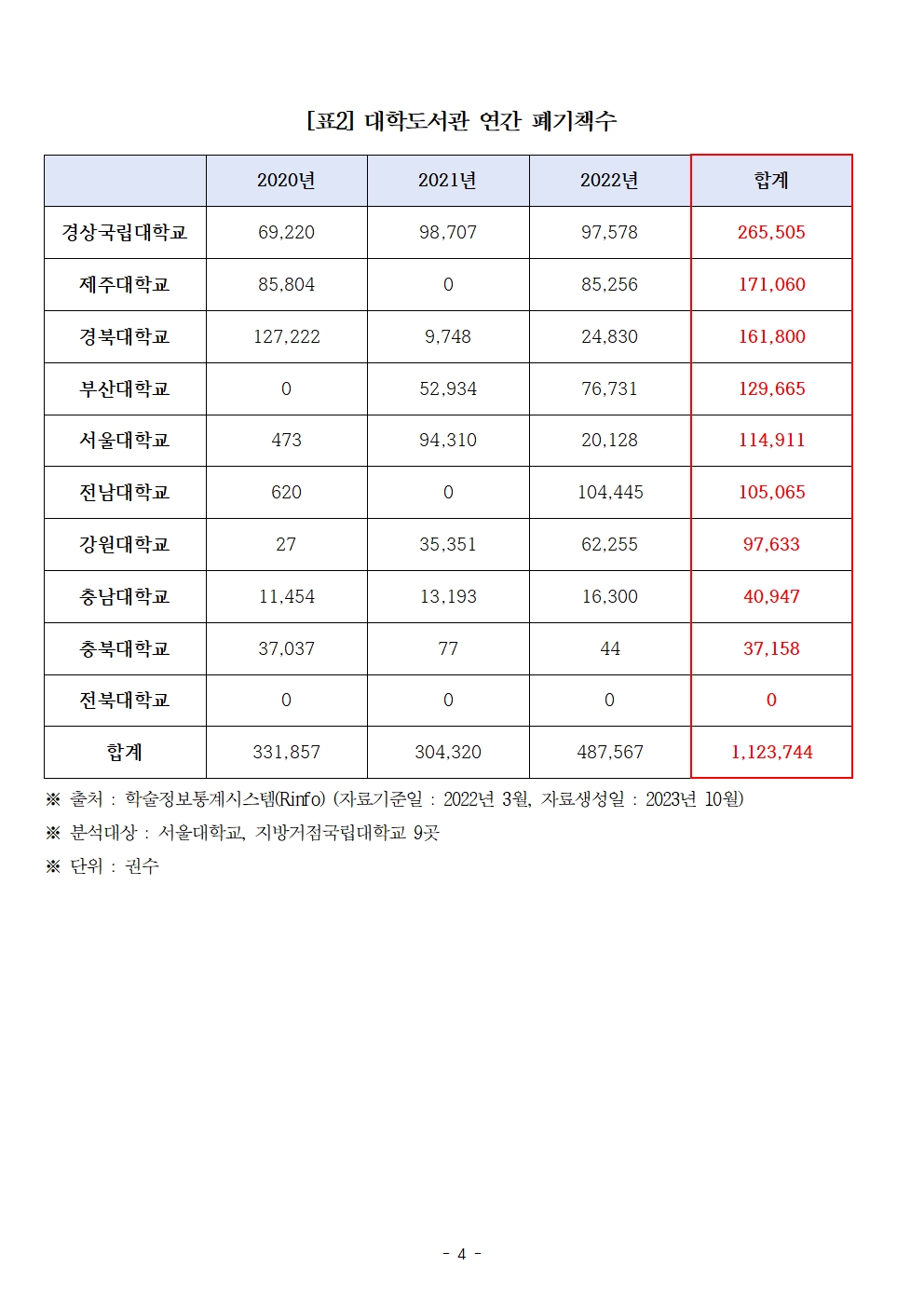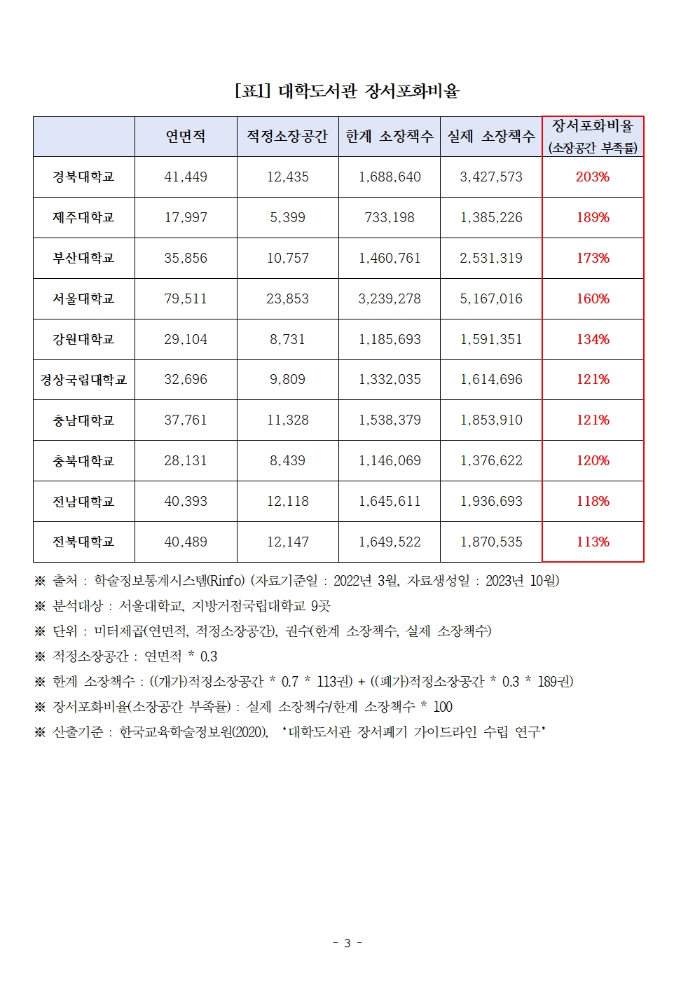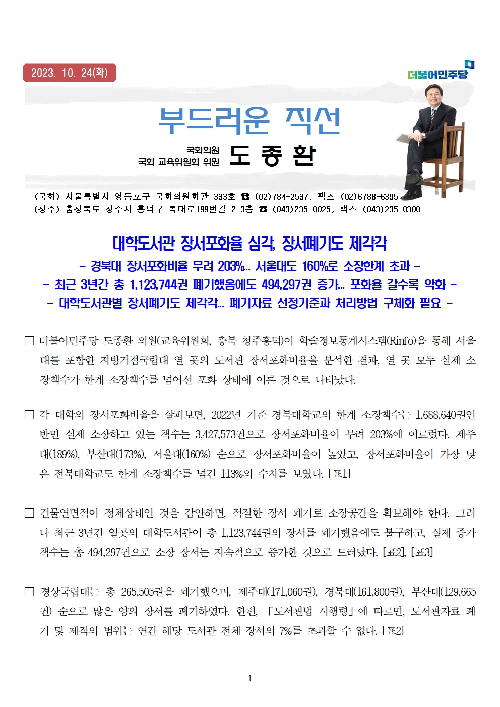 231024 [도종환의원 보도자료] 대학도서관 장서포화율 심각 장서폐기도 제각각.hwp