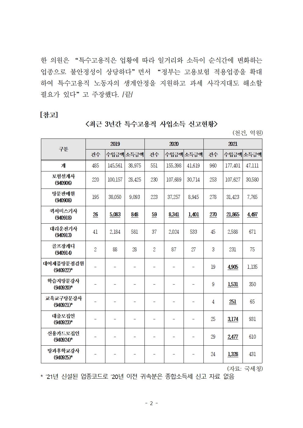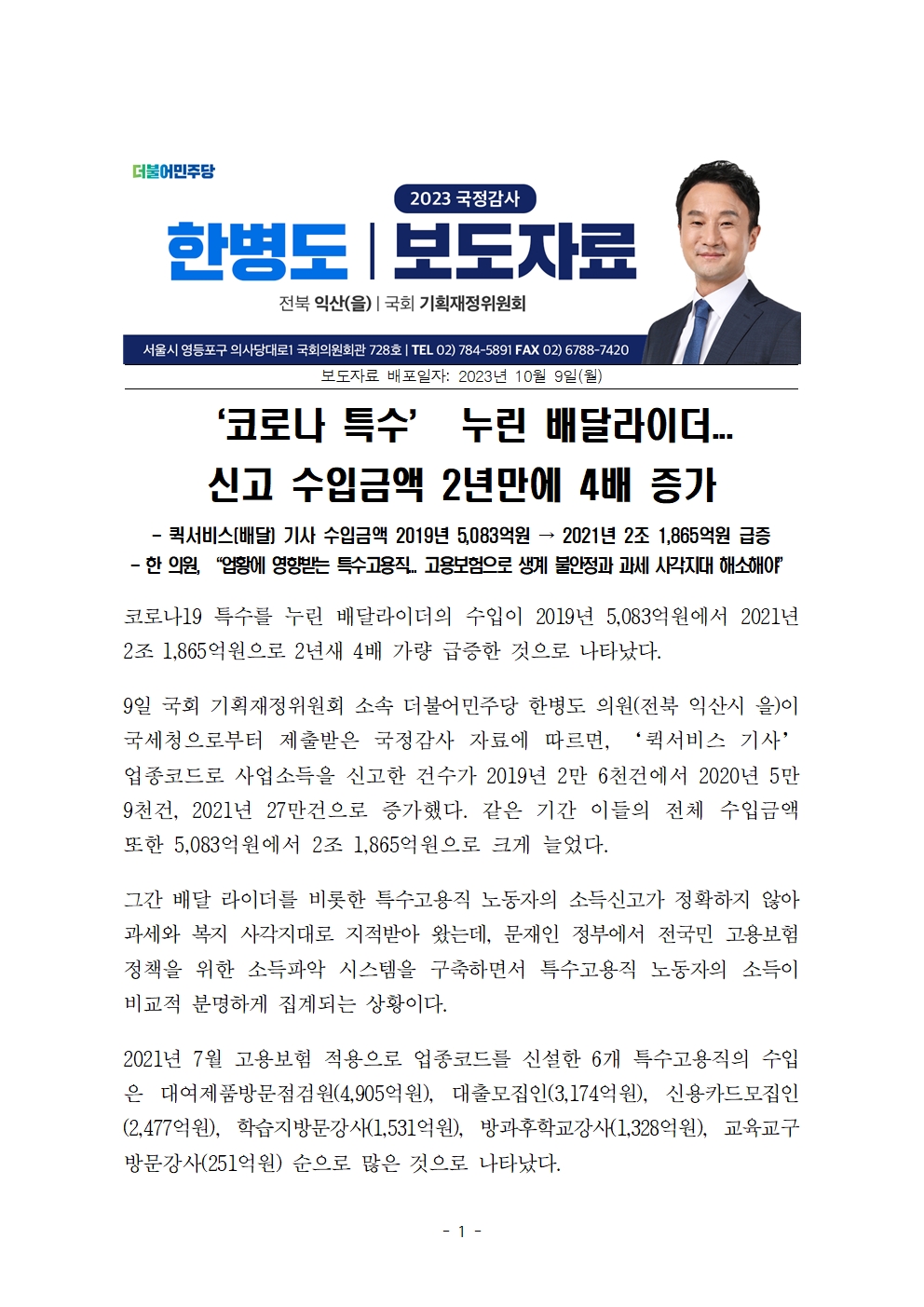 [한병도의원]2023기재위국정감사보도자료(26)_‘코로나 특수’ 누린 배달라이더... 신고 수입금액 2년만에 4배 증가.hwp