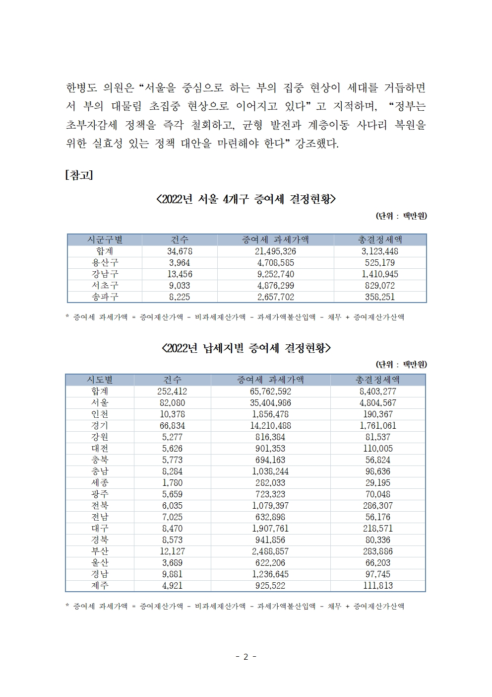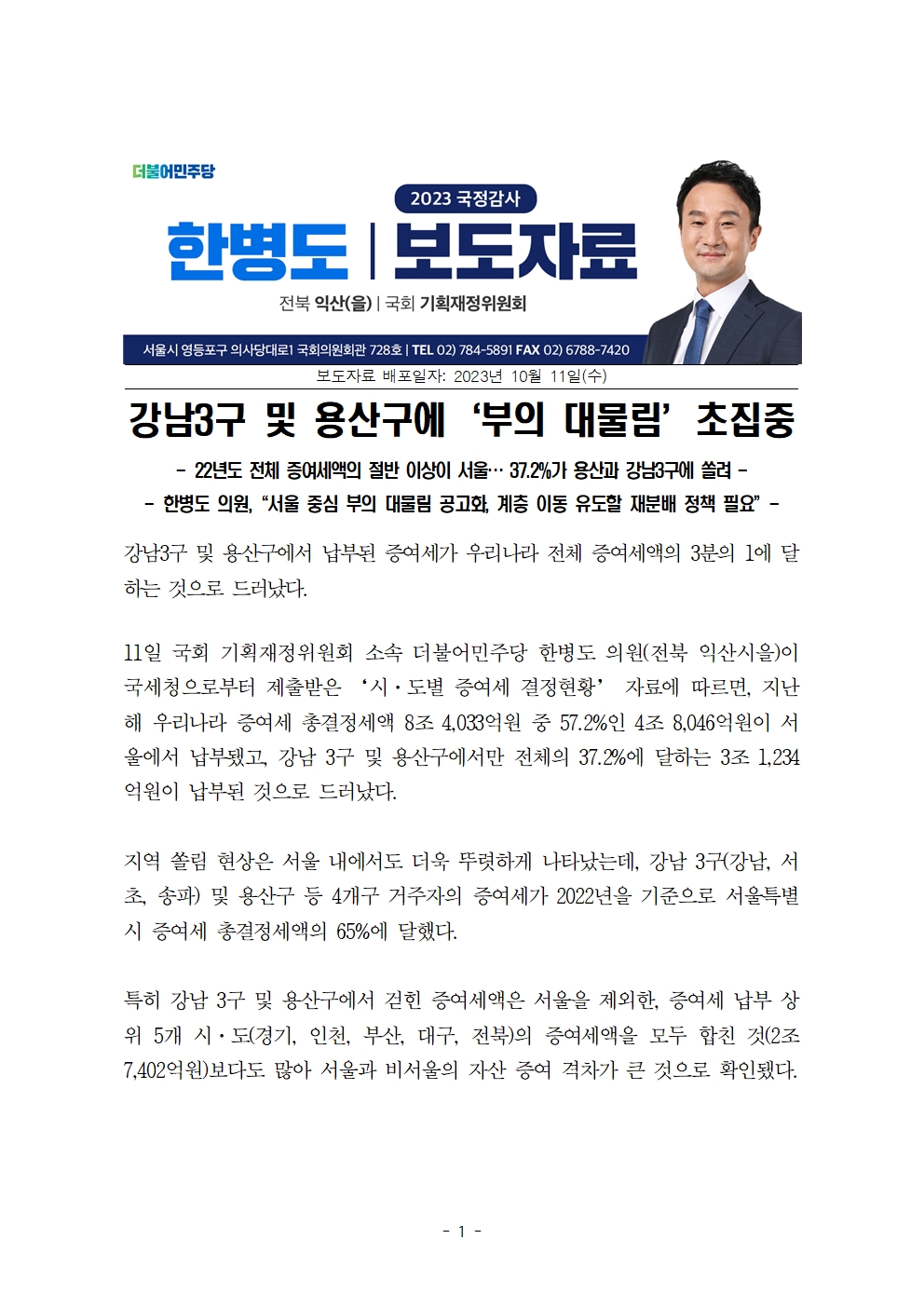 [한병도의원]2023기재위국정감사보도자료(28)_강남 3구 및 용산구에 ‘부의 대물림’ 초집중.hwp