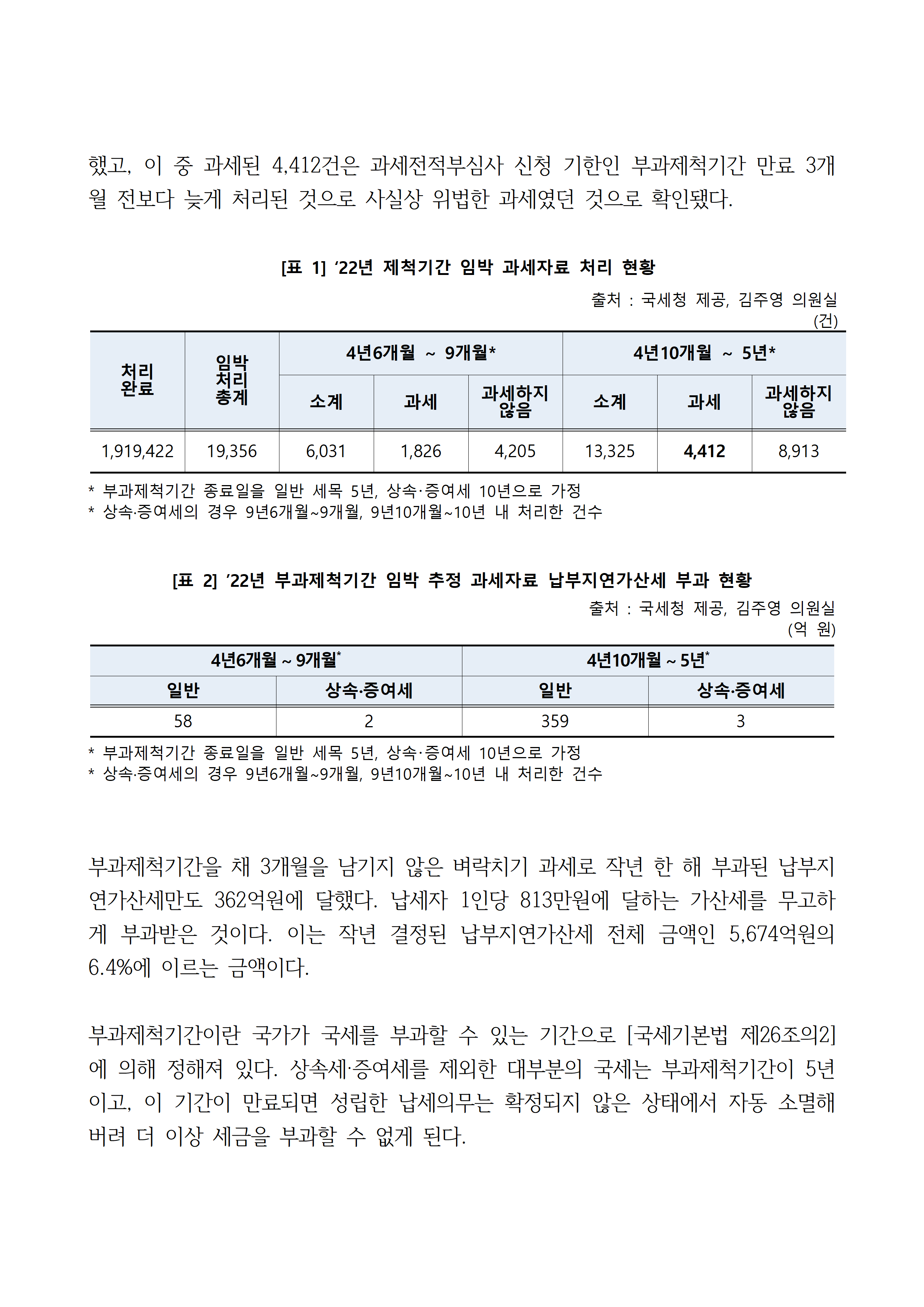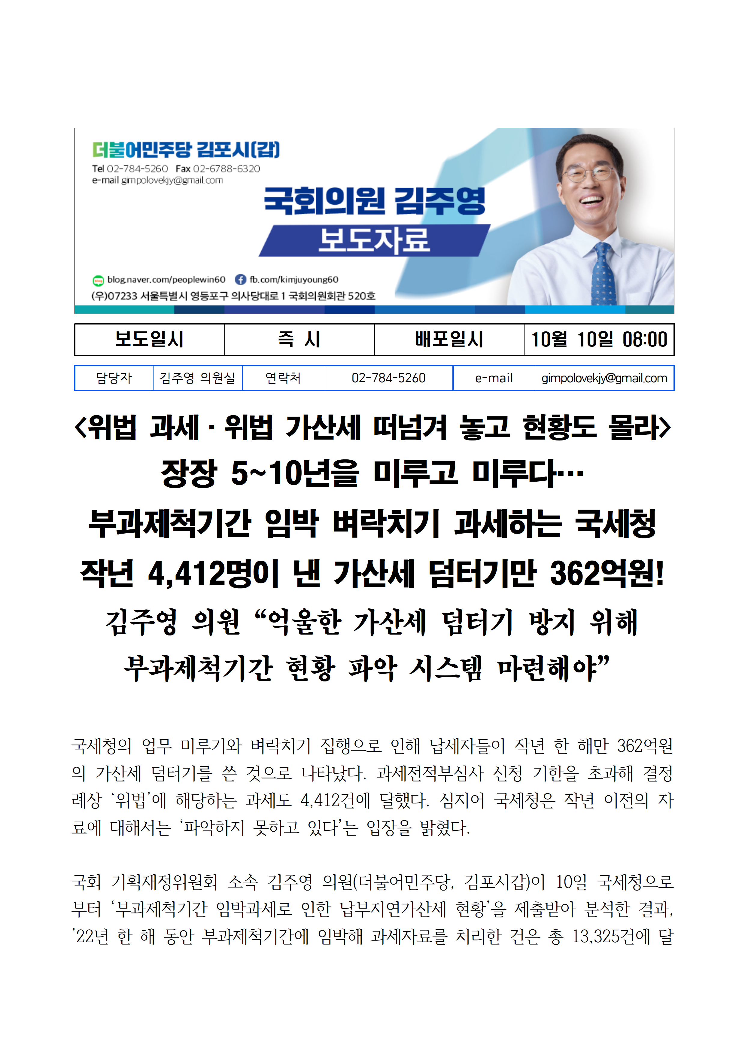 231010_국감보도자료_김주영_의원_부과제척기간_임박_벼락치기_위법과세_국세청_납세자에_떠넘긴_가산세_덤터기_369억원.hwp