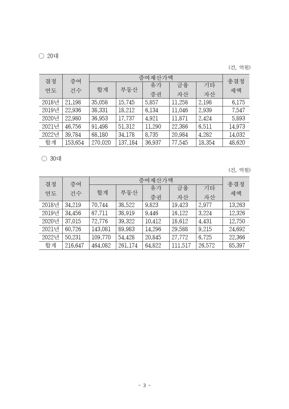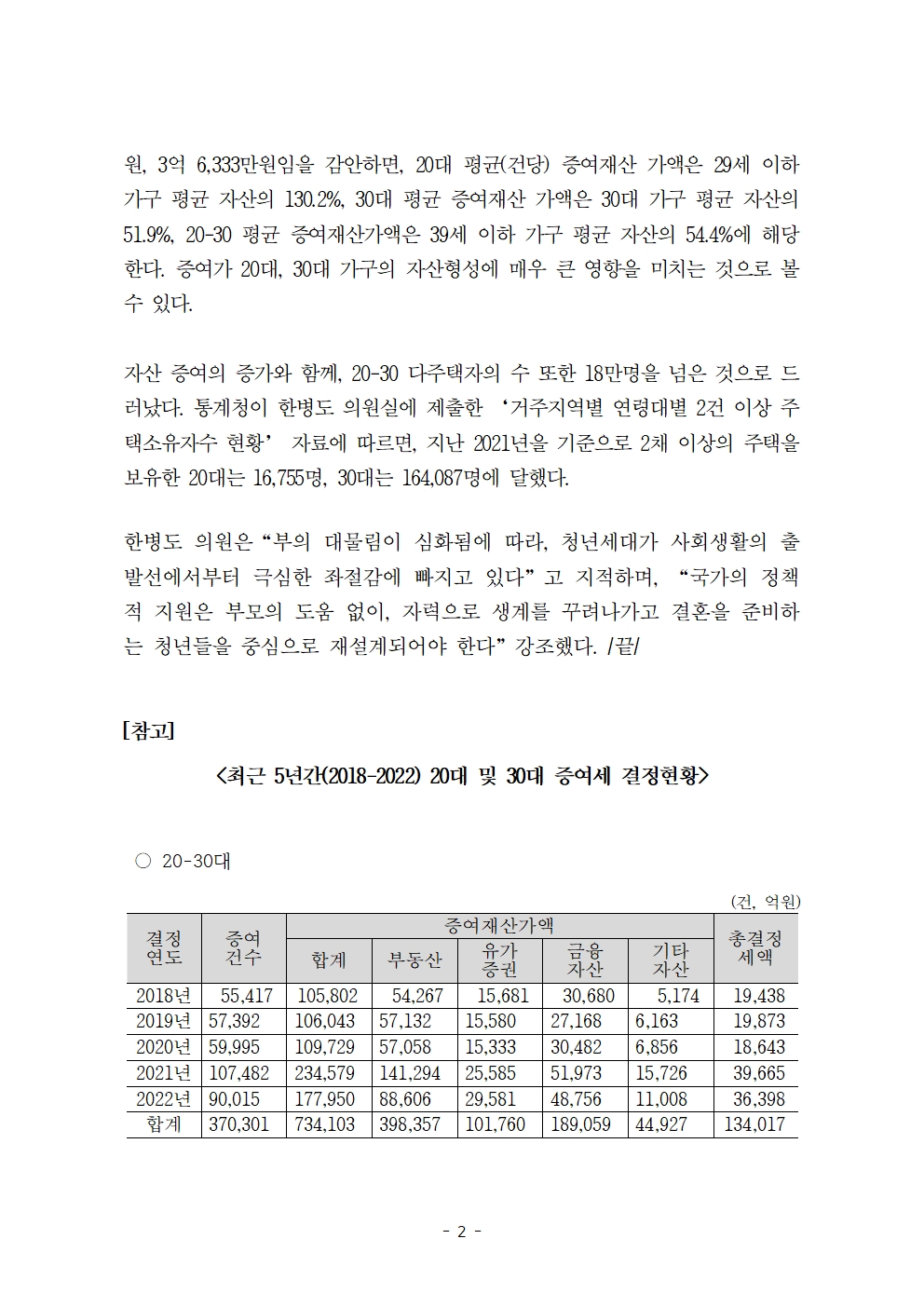 [한병도의원]2023기재위국정감사보도자료(29)_5년간 73조원 증여받은 MZ세대 다주택자도 18만 넘어.hwp