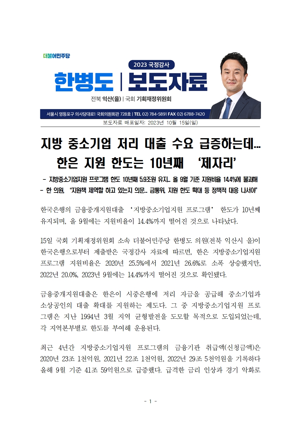 [한병도의원]2023기재위국정감사보도자료(30)_지방중소기업 저리 대출 수요 급증하는데... 한은 지원 한도는 10년째 ‘제자리’.hwp