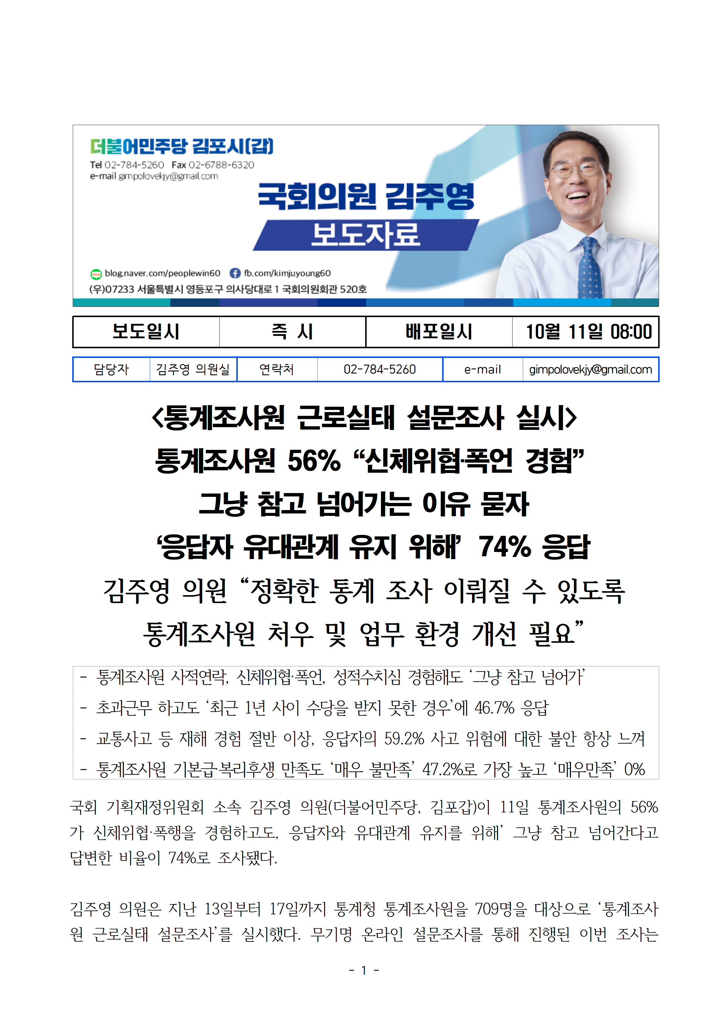 [김주영 의원 국감보도자료] <통계조사원 근로실태 설문조사 실시> 통계조사원 56%“신체위협‧폭언 경험” 그냥 참고 넘어가는 이유 묻자 ‘응답자 유대관계 유지 위해’74%응답