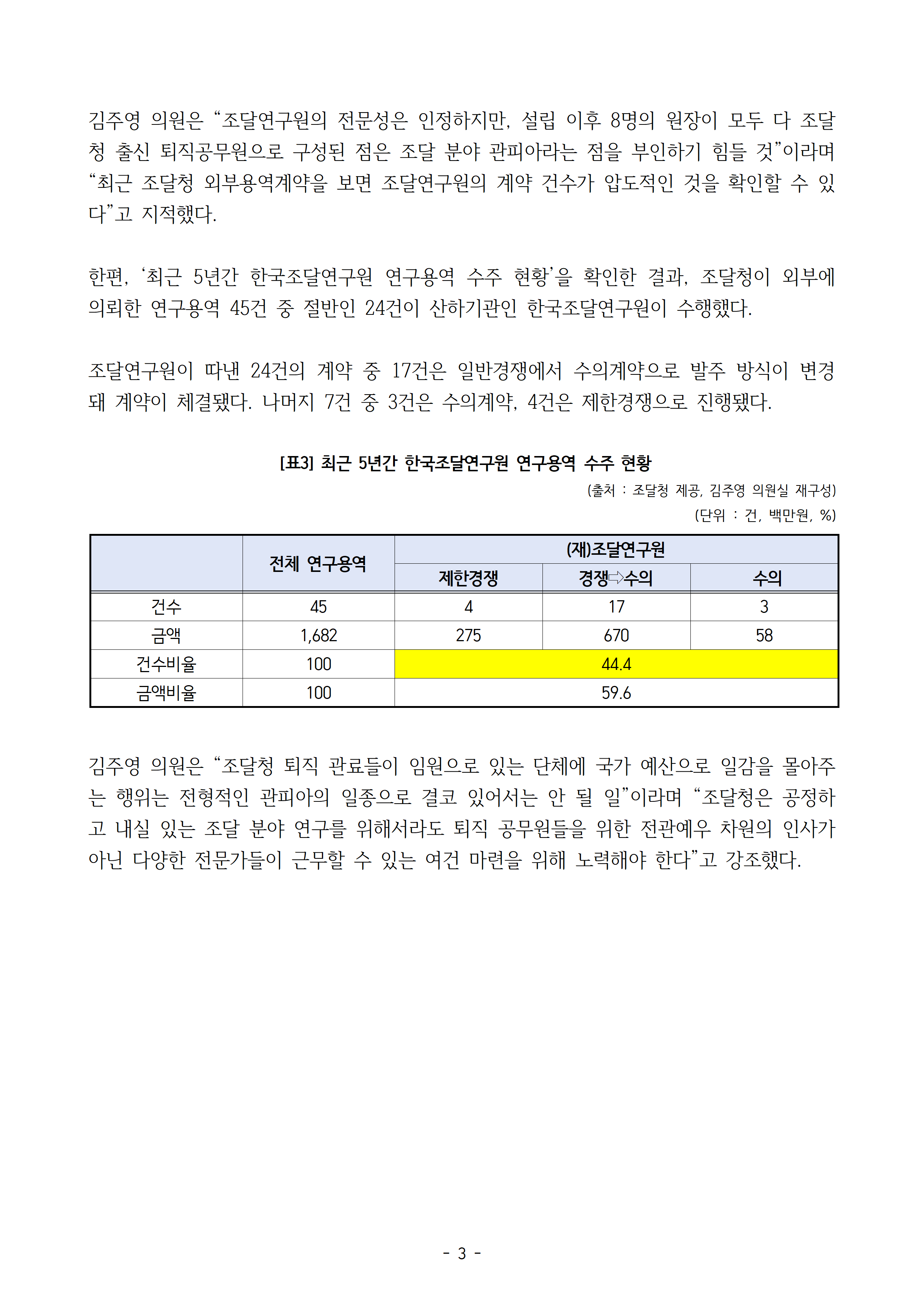 [김주영 의원 국감보도자료]한국조달연구원 승인 이래 줄곧 원장,조달청 퇴직자 출신 조달청-연구원, 2012년부터 215억원 규모 153건 외부용역계약 체결 일반경쟁 계약 단3건