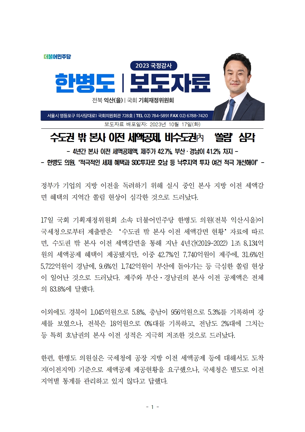 [국회의원 한병도 국감 보도자료] 수도권 밖 본사 이전 세액공제, 비수도권內 ‘쏠림’ 심각