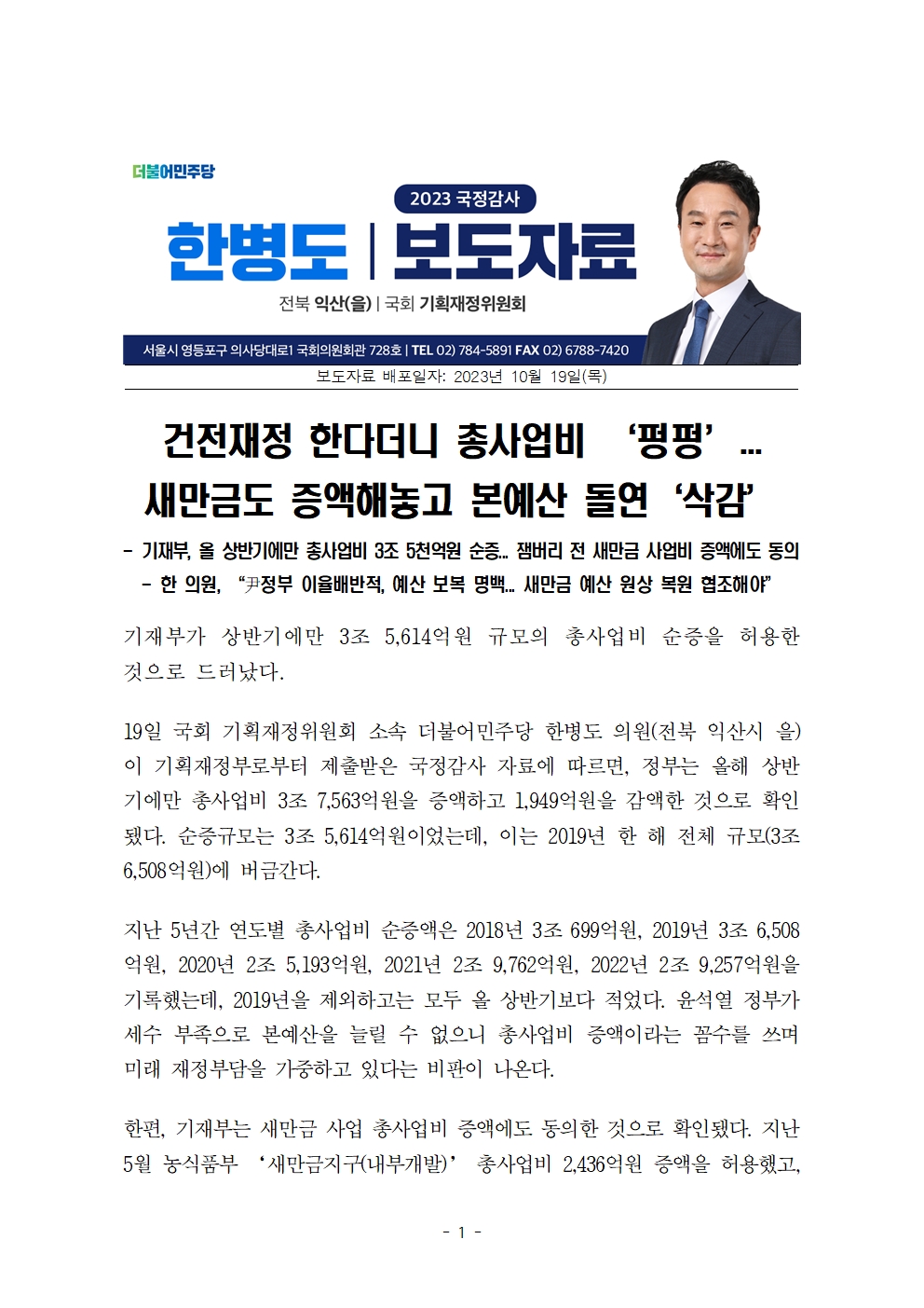[한병도의원]2023기재위국정감사보도자료(33)_건전재정 한다더니 총사업비 ‘펑펑’... 새만금도 증액해놓고 본예산 돌연 ‘삭감.hwp