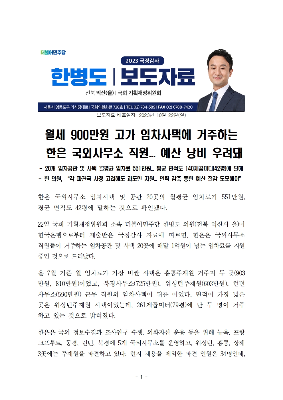 [한병도의원]2023기재위국정감사보도자료(35)_월세 900만원 고가 임차사택 거주하는 한은 국외사무소 직원... 예산 낭비 우려.hwp